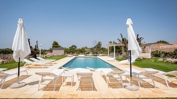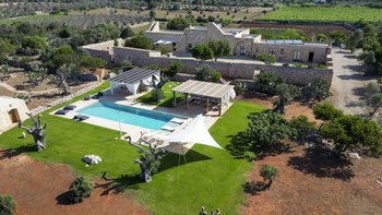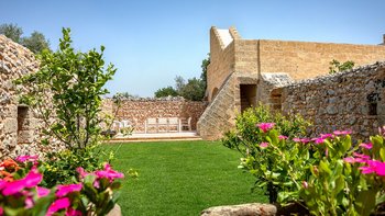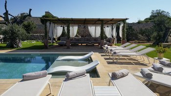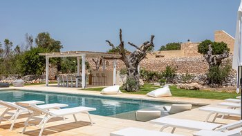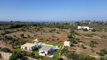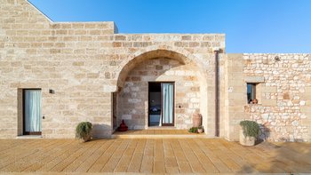 Die Masseria La Corte ist ein elegantes apulisches Bauernhaus mit sechs Schlafzimmern und einladenden Außenbereichen, nur etwas mehr als drei Kilometer von der Küste entfernt.