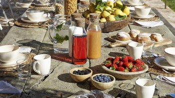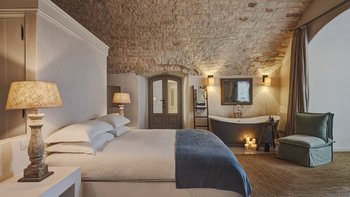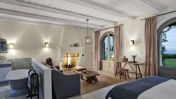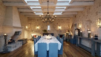 Wenn Sie das Anwesen betreten, werden Sie vom fabelhaften Trajan Dining Room empfangen, in dem bis zu 20 Gäste den professionellen Kochservice der Villa auf einmal erleben können, während das Essen direkt nebenan in der Küche im Erdgeschoss gekocht wird. Verbringen Sie gemütliche Abende am Kamin im Wohnzimmer im Herzen der Villa, bevor Sie durch die vier atemberaubenden Schlafzimmer im Erdgeschoss streifen, von denen zwei miteinander verbunden sind und eines über einen eigenen Eingang zum Hammam verfügt. Jedes Zimmer ist einzigartig und öffnet sich zu einem anderen Teil der Villa und bietet eigene Perspektiven auf die lokale Landschaft. Auf dem Weg nach oben bieten zwei weitere, miteinander verbundene, geräumige Schlafzimmer einen eigenen Panoramablick. Eine Bibliothek und eine zweite Küche und ein Essbereich vervollständigen die erste Etage. Auf der Dachterrasse können Sie ein Bad im Pool auf der Dachterrasse nehmen, bevor Sie an der warmen Sommerluft unter dem Sternenhimmel speisen. Für weitere Speisemöglichkeiten verfügen sowohl der Innenhof und auch die Gartenterrasse über eigene Esstische und es gibt einen zusätzlichen Grillplatz an der Außenküche am Pool.