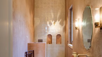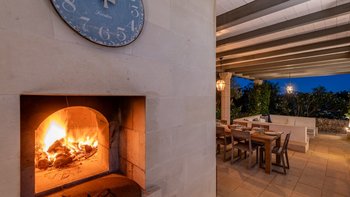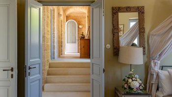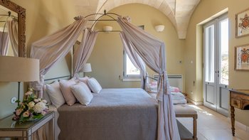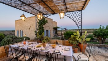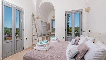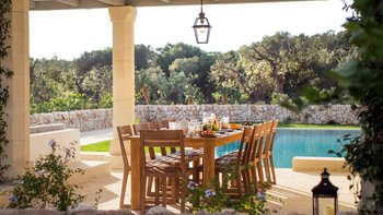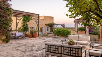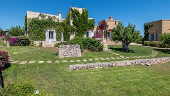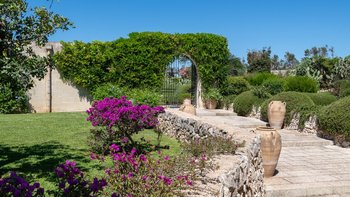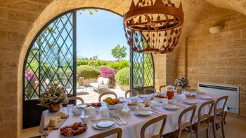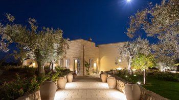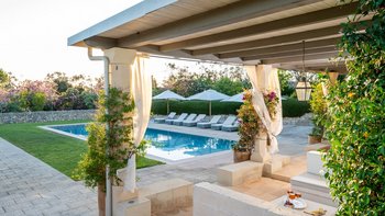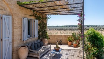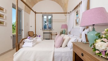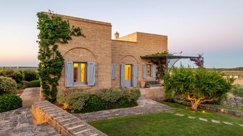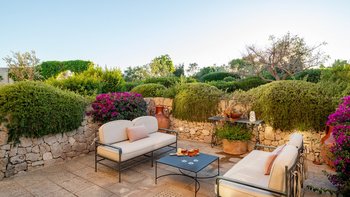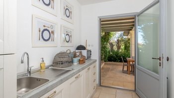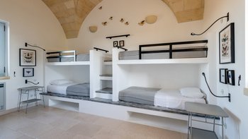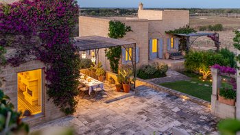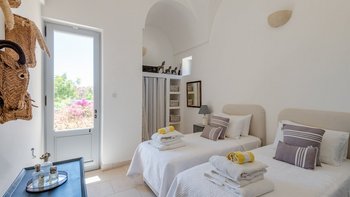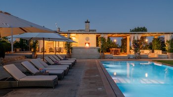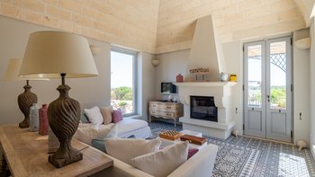 Die Masseria Pino Marittimo mit ihren Gewölbedecken, exquisiten Bögen und freiliegenden Steinmauern deutet auf den ersten Blick darauf hin, dass es sich um ein makellos restauriertes Bauernhaus handelt. Deren Masseria Pino Marittimo wurde 2014 erbaut, um die Schönheit Apuliens architektonischer Traditionen zur Schau zu stellen. Deren Eigentümer beauftragten OKA mit der Inneneinrichtung und der Villa und verfügen über maßgeschneiderte Handwerkskunst, die durch moderne Annehmlichkeiten wie ein Kühlsystem in jedem Zimmer und eine voll und ganz ausgestattete, moderne Küche ergänzt wird. Deren Villa mit Blick auf kilometerlange offene Landschaften liegt in einem gepflegten Garten mit Rasenflächen mit Zitronen- und Orangenbäumen, in einem ruhigen Olivenhain, etwas außerhalb des Dorfes Serrano. Im Haupthaus gibt es drei Schlafzimmer, ein luftiges Esszimmer mit kunstvollem Kronleuchter und langem Refektoriumstisch und ein kühles Wohnzimmer, dessen schlichter Stil perfekt für den aufwendig gefliesten Boden ist. Drei weitere Zimmer im Nebengebäude verfügen über ein Stockbettzimmer, ideal für Kinder. Und der Poolbereich mit Gartenrasen ist der Mittelpunkt für das Leben im Freien, komplett mit Esspavillon mit angrenzendem Sitzbereich, Sommerküche und Kinderspielzeug.