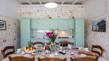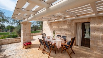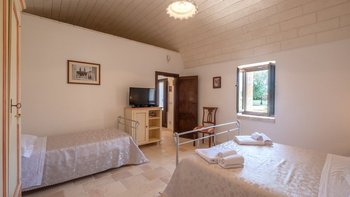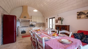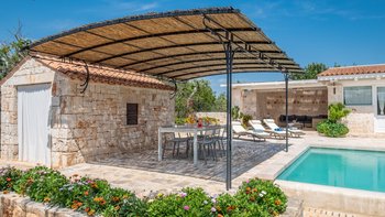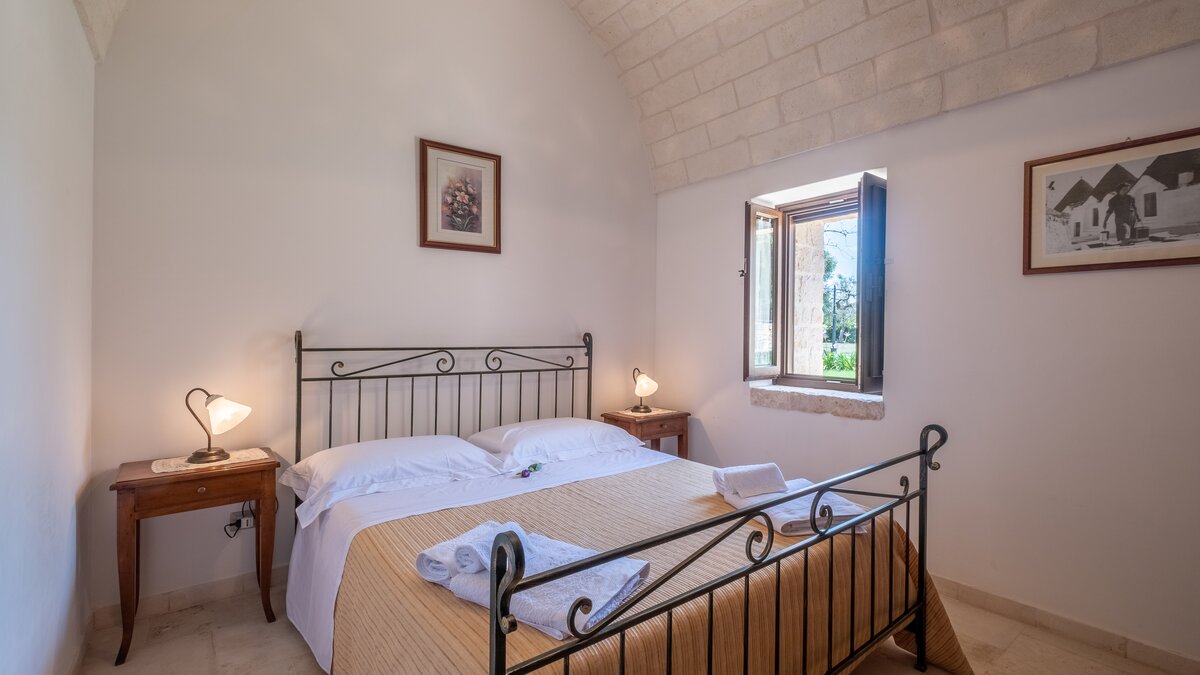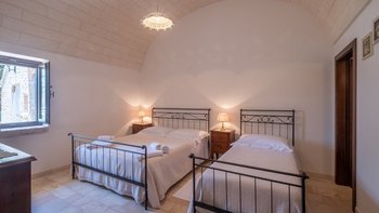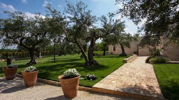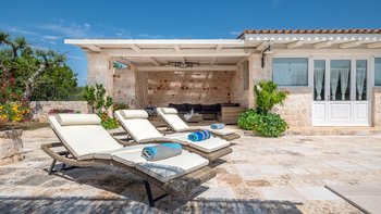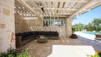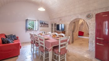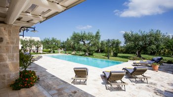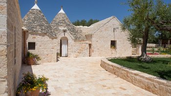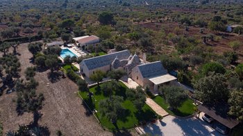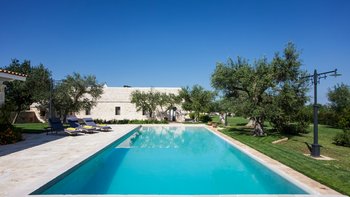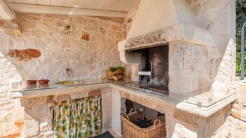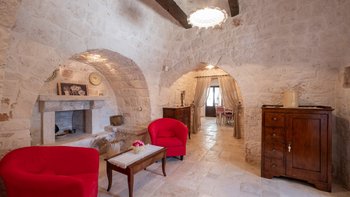 Breite Rasenflächen, gepflasterte Wege und viele alte Bäume umgeben dieses traditionelle Trulli-Haus, das wie eine kleine Insel der Ruhe in einem Meer von ländlichem Grün wirkt. Dessen Villa wird von ihren dicken Kalksteinmauern und Kegel- oder Tonnengewölbedecken natürlich kühl gehalten und bewahrt ihren rustikalen Charakter. Während der Komfort des 21. Jahrhunderts mit modernen Duschräumen, WLAN, Smart TV und modernen Küchengeräten ausgestattet ist, setzt die sympathische Restaurierung rustikal-schicke Möbel neben antike Stücke und lokal gefertigte bestickte Stoffe auf elegant schlichte schmiedeeiserne Betten. Dessen charmantes Wohnzimmer der Villa, das größtenteils für Ruhe in sanften Erdtönen gestaltet ist, ist die lebhafte Ausnahme, mit leuchtend roten Sesseln, die scharf an den hellen Steinmauern angebracht sind. Die Landhaus-Küche / Esszimmer ist ein sehr geselliger Raum, der sich auf eine schattige Essterrasse öffnet; und jedes der drei übersichtlichen Schlafzimmer verfügt über ein eigenes Duschbad. Draußen wird ein großzügiger Infinity-Pool von einem Super-Poolhaus mit Dusche, einem Essbereich mit gut ausgestatteter Küchenzeile und einem Pavillon mit gepolsterten Rattansofas serviert. Und die Villa ist nur 5 km von den Annehmlichkeiten in Alberobello und 15 km von einem Sandstrand entfernt.