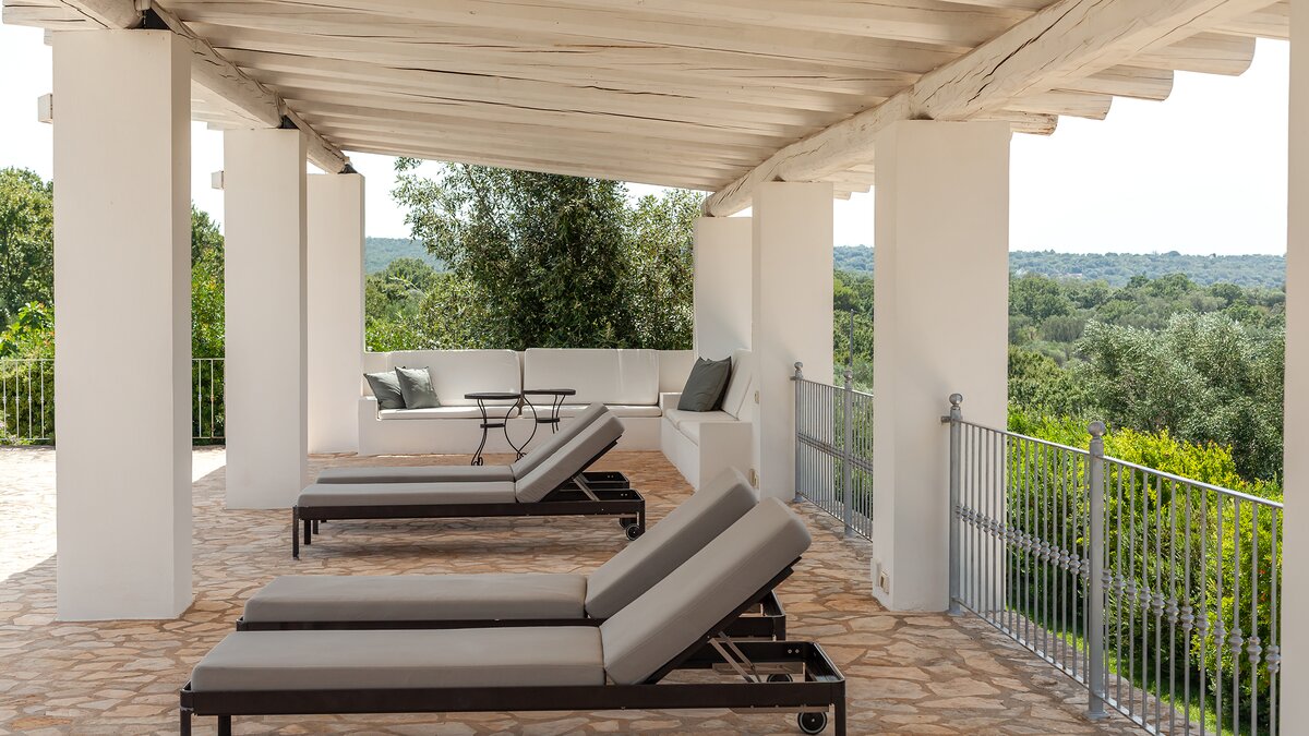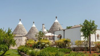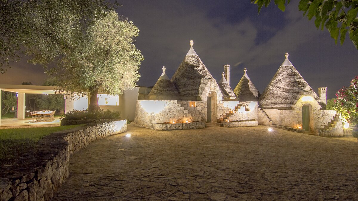 Mit einer Ansammlung von fünf Trulli-Kegeln, die das Haupthaus bilden, und einem modernen Nebengebäude mit vier Schlafzimmern direkt unterhalb der Poolterrasse ist diese entzückende Villa perfekt für Familientreffen. Auf dem ländlichen Grundstück eines privaten Anwesens, wo die Gäste auf gewundenen Wegen durch Felder zu Trulli-Ruinen folgen können, genießt das Haus eine außergewöhnliche Ruhe, umgeben von schönen abfallenden Rasenflächen mit Feigenbäumen und Blumenbänken, großen Terrassen mit schöner Aussicht und einem 16-Meter-Pool mit Hydromassagedüsen. Die Steinböden, Wände und Bögen des Trulli beherbergen zwei Schlafzimmer, zwei Sitzbereiche, eine voll ausgestattete, aber sehr ländliche Küche und ein Esszimmer, das sich zu einer überdachten Veranda öffnet, wo ein Grill und ein Pizzaofen die Mahlzeiten im Freien problemlos erledigen. Aller sechs Schlafzimmer haben einen externen Zugang und ein eigenes Bad mit Dusche, und es gibt eine Klimaanlage in der gesamten Villa, und Plasma-Fernseher sowohl im Trullo und auch im Nebengebäude. Trulli Ferragosto ist eine Mischung aus Charme der alten Welt und modernem Komfort und liegt in der Nähe von Stränden und mehreren hübschen Städten und 7 km von Geschäften und Restaurants in Ceglie Messapica entfernt.