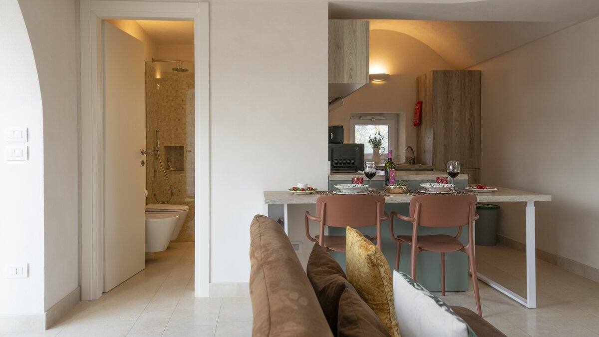 Im Inneren können die Gäste die OFFENER GRUNDRISS Küche, den Ess- und den Wohnbereich nutzen. Mit viel Tageslicht und modernen, eleganten Möbeln bietet dieser Bereich eine entspannte und beruhigende Atmosphäre. Mit großen französischen Türen, die sich zum Außenbereich öffnen, kann ein nahtloses Leben im Innen- und Außenbereich genossen werden. Weiters in der Villa gibt es ein Schlafzimmer mit Doppelbett, einen großen Kleiderschrank und ein Duschbad.