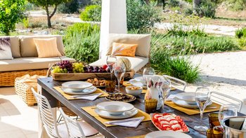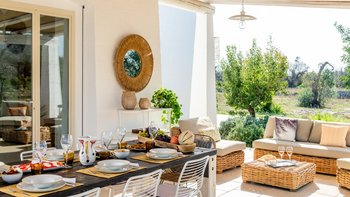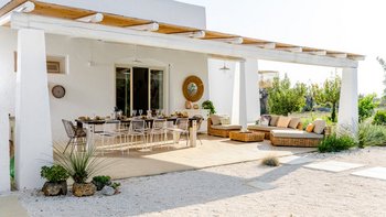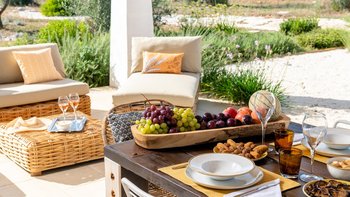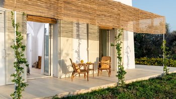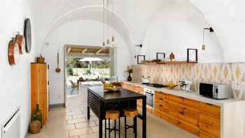 Im Inneren öffnet sich eine gut ausgestattete Küche mit gemusterten Kacheln zu einem ruhigen, gewölbten Sitz- und Essbereich. Des Hauptschlafzimmer mit Doppelbett liegt auf der einen Seite des Wohnraums, während zwei weitere geräumige Schlafzimmer von der gegenüberliegenden Seite erreicht werden können. Jedes Zimmer verfügt über französische Fenster, die direkt in die Gärten führen. Denen jungen Eigentümer haben das Haus mit durchdachten Holzteilen und regionaler Keramik eingerichtet, die den Innenräumen einen ruhigen, authentischen Charakter verleihen. Im Freien bietet eine Terrasse bequeme Sitzgelegenheiten, während eine andere, von der Küche aus geöffnet, eine schattige Pergola zum Essen bietet.