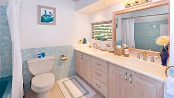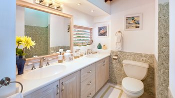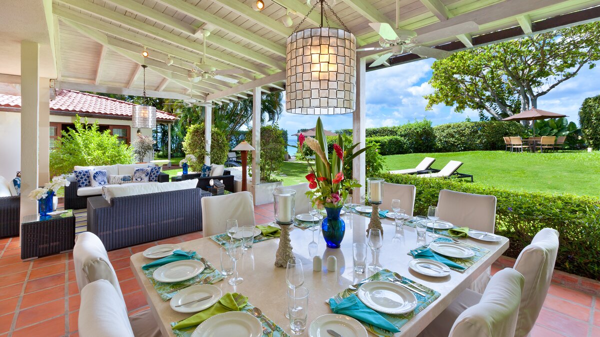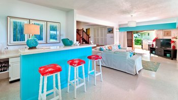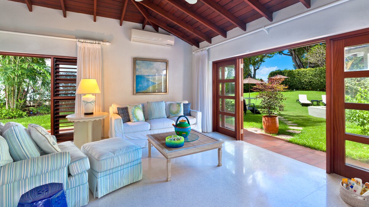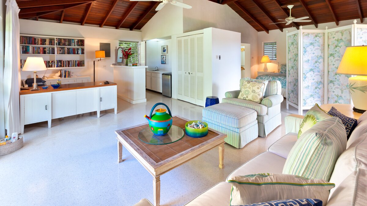 Drei Stufen vom Essbereich entfernt, befindet sich ein offenes Wohnzimmer mit großen Sofas, einer gemütlichen Bar und einem kleinen Frühstücksbereich und öffnet sich auf eine schattige Terrasse, die von Muschellaternen beleuchtet wird und auf die Rasenflächen am Meer trifft. Des Cottage, nur ein paar Meter über dem Gras, ist eine schöne offene Anordnung von Kingsize-Schlafzimmer, Wohnzimmer und Küchenzeile. Neben der historischen St. James Kirche liegt die Villa 800 m vom lebhaften Holetown und einen kurzen Spaziergang entlang der Promenade vom Schnorcheln im Folkestone Marine Park entfernt.