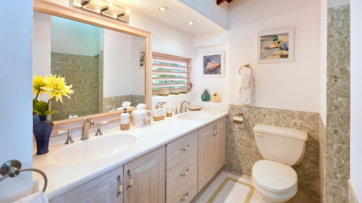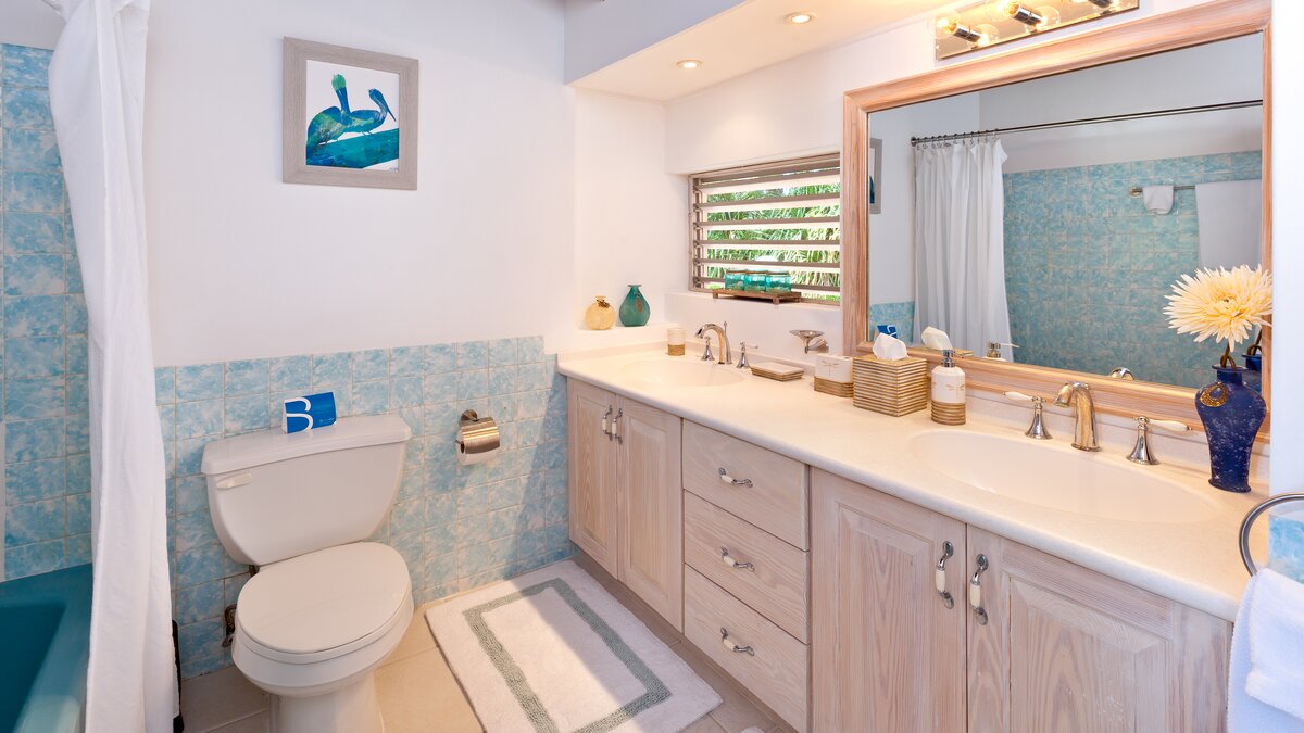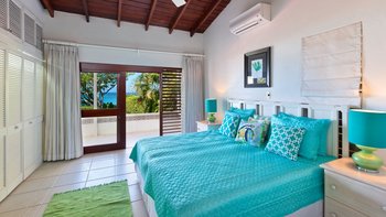 Diese helle und einladende Villa ist privat von alten Bäumen abgeschirmt, mit Rasenflächen und Terrassen für das Leben im Freien und dem klaren Wasser der Karibik, das eine weiße Sandbucht am Fuße des Gartens umspült, ein vollkommen charmanter Ort zum Entspannen. Im gesamten Haus vermischen sich Dekor und Möbel knackig weißes mit lebhaften Stoffen in Rot- und Aquatönen, Deckenventilatoren verstärken die kühlende Meeresbrise und WLAN steht zur Verfügung, um mit der realen Welt in Berührung zu kommen. Der Eingang zum Haupthaus führt in das doppelte Esszimmer, von dem aus eine offene Treppe zu zwei klimatisierten Schlafzimmern mit eigenem Bad im Obergeschoss führt, jedes mit einer Dachsparrendecke und Türen zu einem gemeinsamen Balkon mit Meerblick.