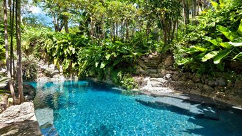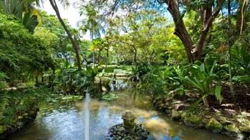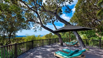 Das Fustic House wird von bewaldeten Hängen umschlossen, die sich vom Meer aus erstrecken und die Gäste in einem abgelegenen, tropischen Grün verwöhnen. Diese vollkommen privaten Spaziergänge umschließen einen kleinen See, den sogenannten Duck Pond, und einen Lagunen-Pool, der aus dem Korallenstein gegraben wurde und auf der ganzen Welt wie eine Waldquelle aussieht. Ein Pfad schlängelt sich hinunter zu einem Sandstrand, der etwa zehn Minuten entfernt liegt. Dessen Haus steht stolz hoch auf einem Bergrücken und seine Säulenterrassen umrahmen einen fantastischen Blick auf das Meer.