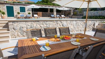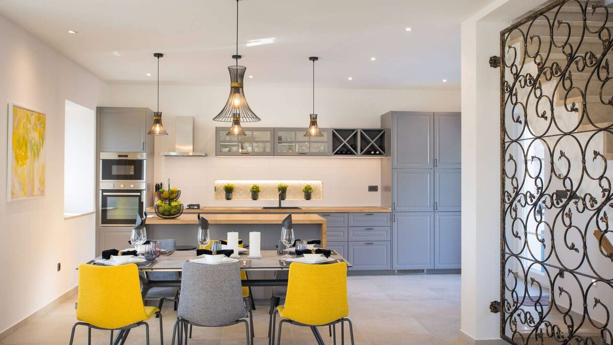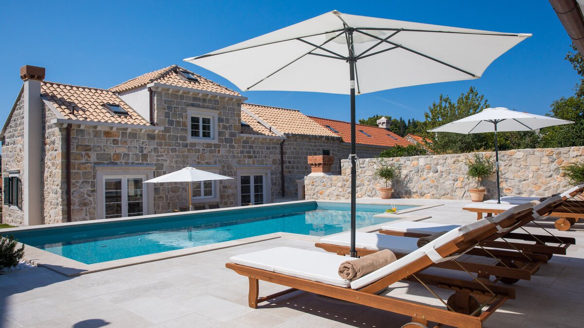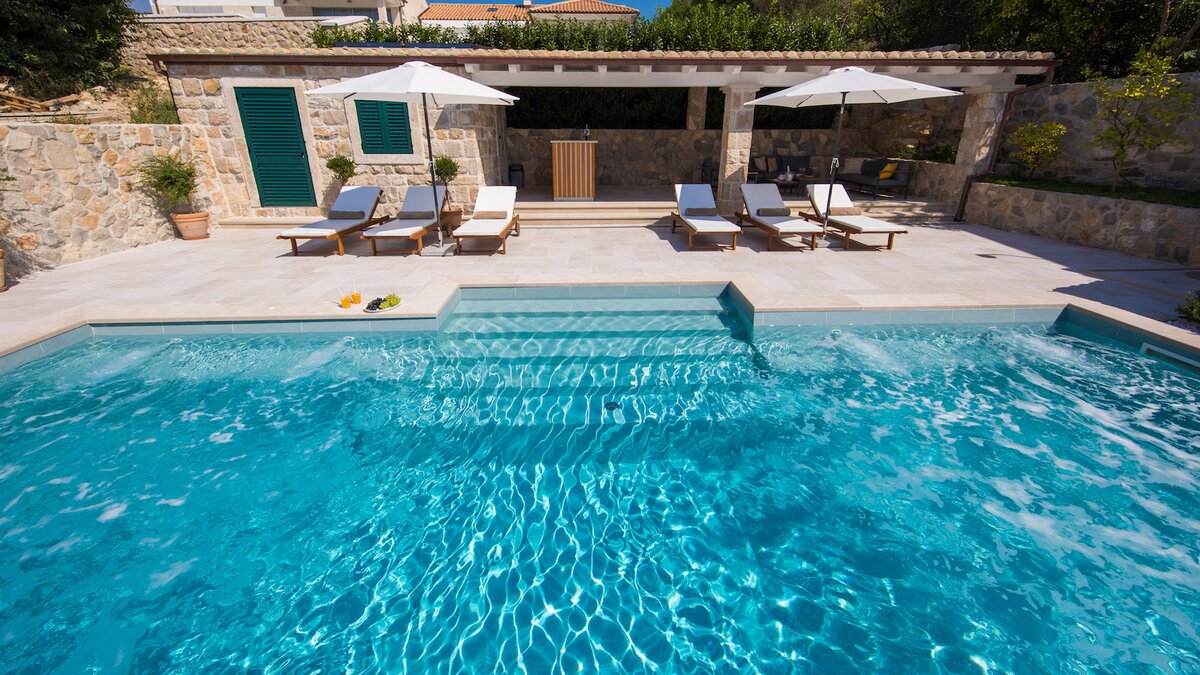 Villa Cavtat ist eine wunderbar moderne und geräumige Unterkunft, die sich ideal für Familien eignet. Dieser charmante Anwesen ist innen und außen wunderschön und zeigt stolz authentischen kroatischen Kalkstein in vielen seiner Elemente. Betreten Sie das Haus, um ein schönes, minimalistisches Wohnzimmer mit farbigen Akzenten zu entdecken. Der Essbereich und die voll ausgestattete Küche sind ähnlich stilvoll. Im Erdgeschoss befindet sich auch ein helles und luftiges Schlafzimmer mit Doppelbett, das mit eigenem Bad und Zugang zu einer kleinen Terrasse ausgestattet ist. Im Obergeschoss befinden sich zwei weitere Schlafzimmer, jedes mit eigenem Bad. Das Äußere der Villa ist ebenso beeindruckend, mit einem eingebauten Grill und einem Esstisch im Freien für unvergessliche Abendessen unter Sternenhimmel. Der große Pool, umgeben von Liegestühlen mit Sonnenschirmen, ist der perfekte Ort, um sich nach einem erlebnisreichen Tag in der Umgebung abzukühlen. Es gibt auch eine Bar im Freien.