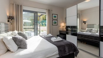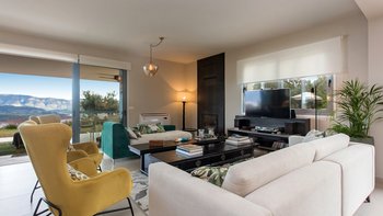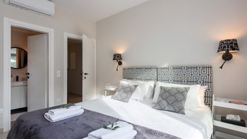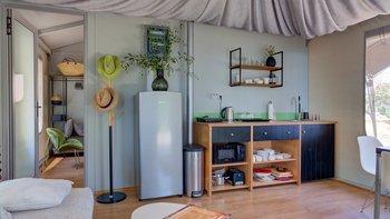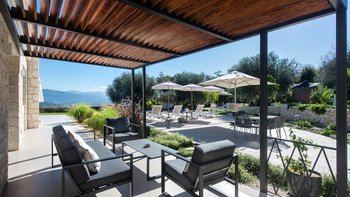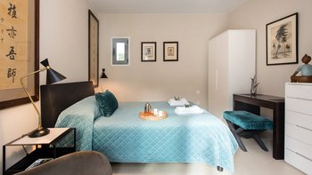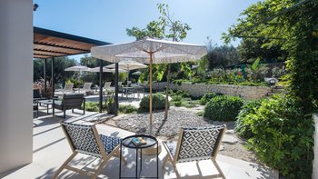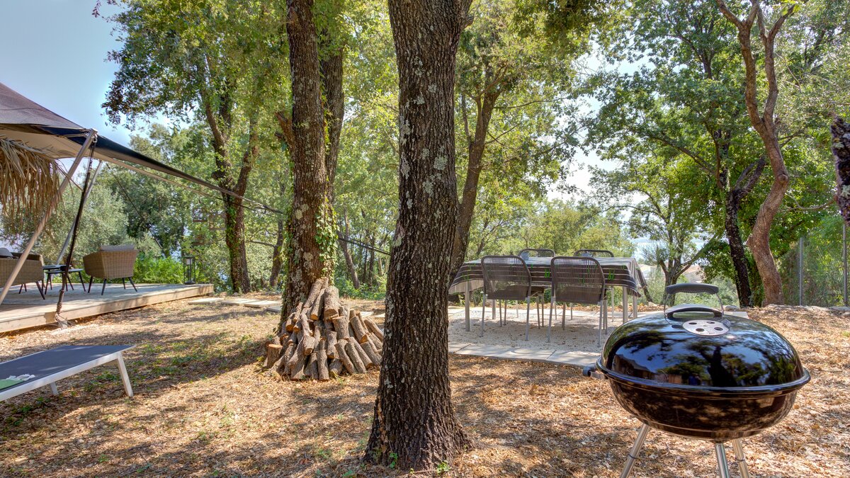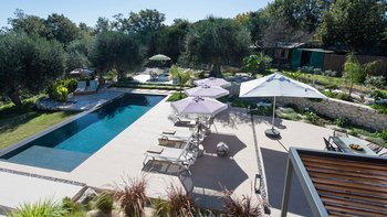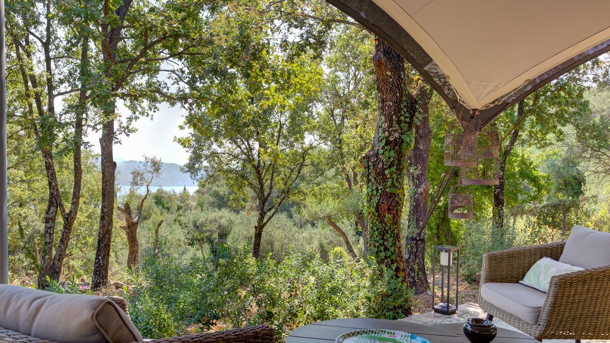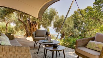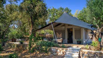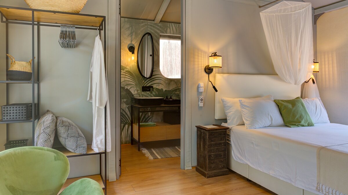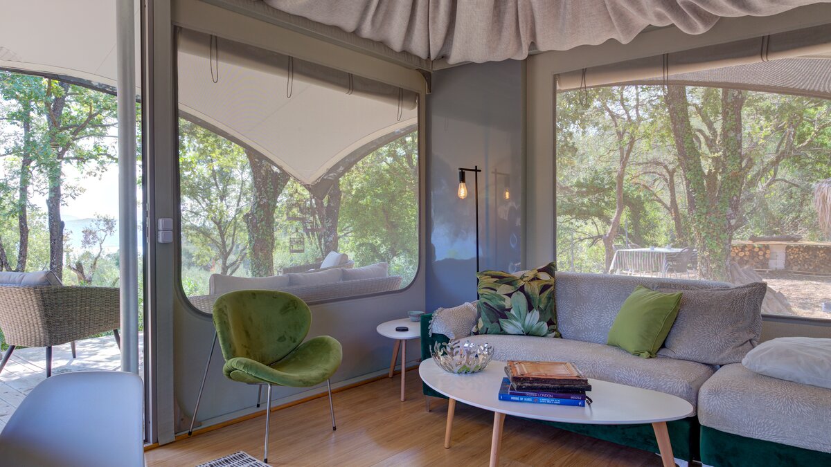 Das elegante und stilvolle Interieur der Villa Amavi bietet einen offenen Wohnbereich mit natürlichem Licht, in dem die Küche, der Wohn- und Essbereich mühelos in die großen Pergolen übergehen. Zwei Schlafzimmer mit eigenem Bad führen direkt zum Poolbereich und schaffen eine intuitive Innen- und Außenlebensumgebung. Dessen markanteste Merkmal des Anwesens ist sein weitläufiges 45 Quadratmeter großes Glamping-Safarizelt, das zwischen Eichen- und Olivenbäumen liegt und ein Gefühl von Privatsphäre und Abgeschiedenheit bietet, während es nur 40 Meter vom Haupthaus entfernt ist. Es dient als privates drittes Schlafzimmer mit eigener Terrasse, Liegestühlen und Grillplatz.