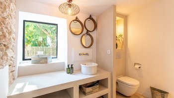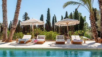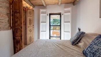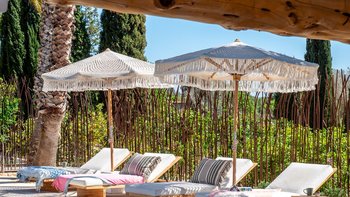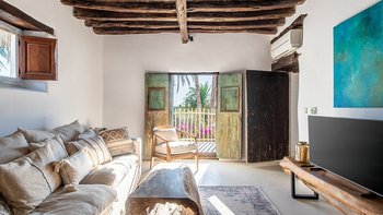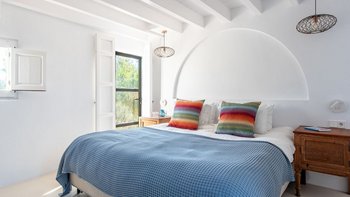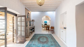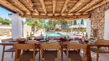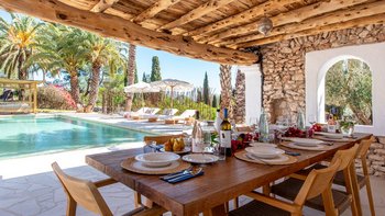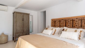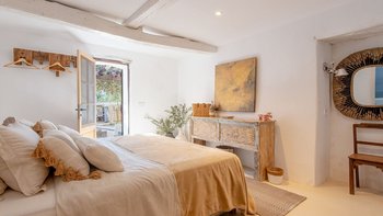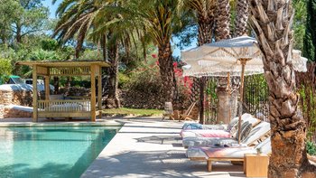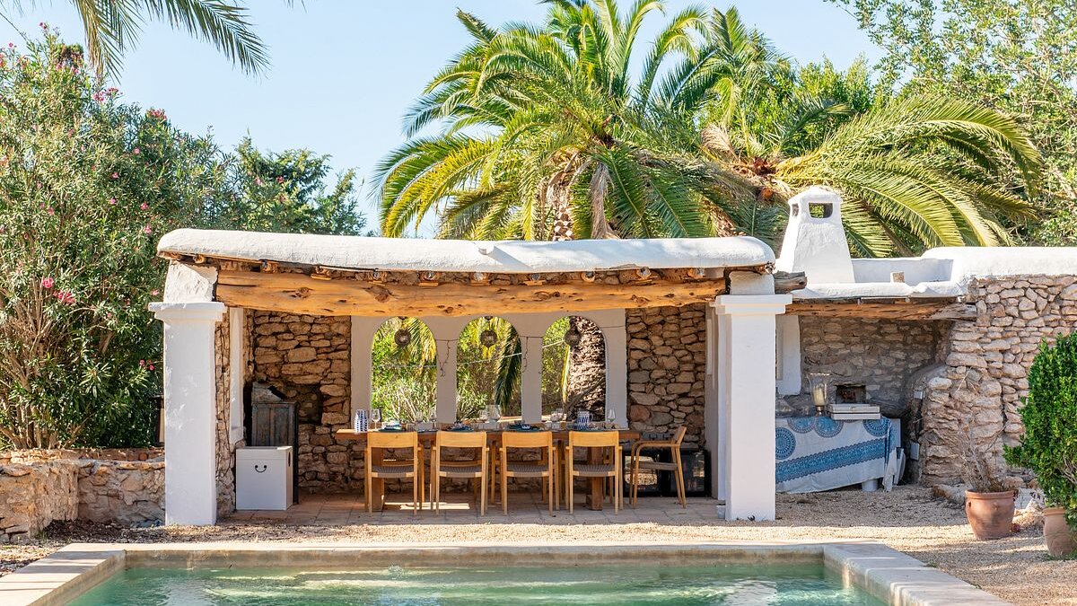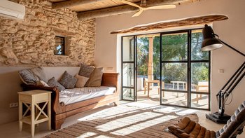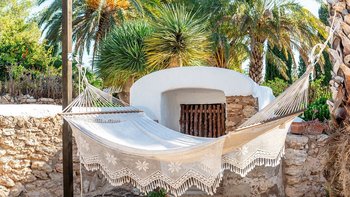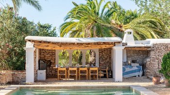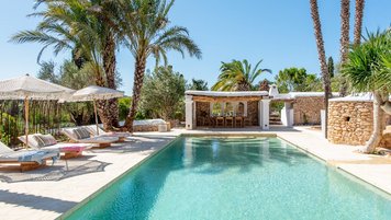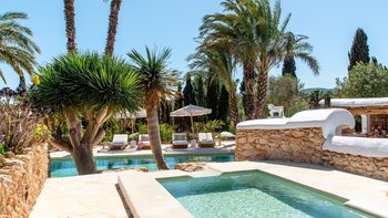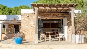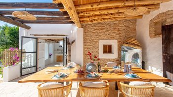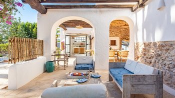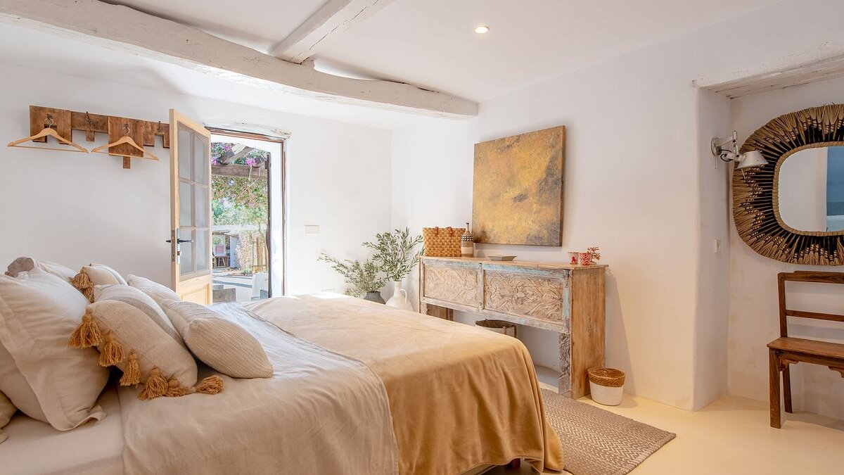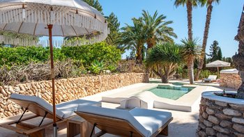 Diese schicke und im Boho-Stil gestaltete Villa befindet sich auf einem zwei Hektar großen, wunderschön gepflegten Grundstück und ist der perfekte Rückzugsort für alle, die in der ibizenkischen Landschaft entspannen möchten.