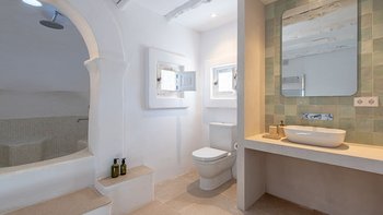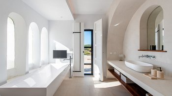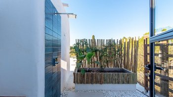 Im Außenbereich, umgeben von Zitrone, Olive, Orange und Palmen, befinden sich mehrere Terrassen, zwei Außenbereiche mit Grill- und Barbereich, ein großer Swimmingpool und ein Jacuzzi. Eine Feuerstelle ist ebenfalls vorhanden, wenn die Gäste bis in den späten Abend hinein ins Freie gehen möchten.