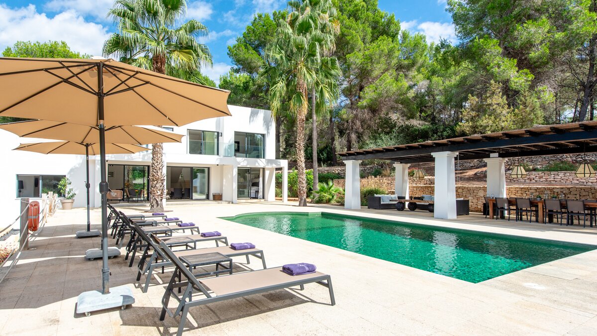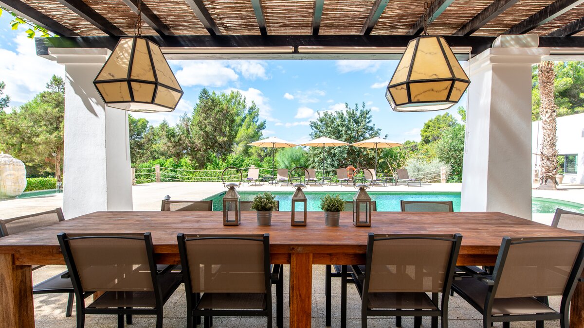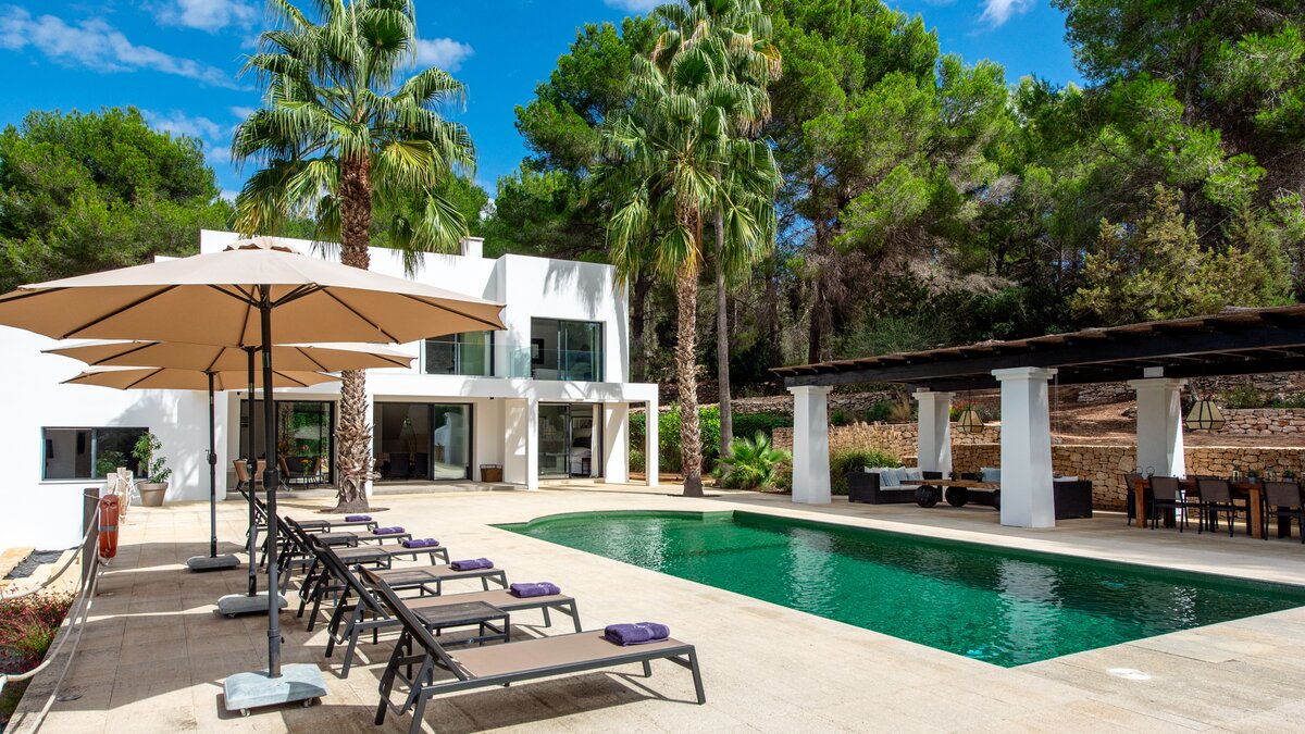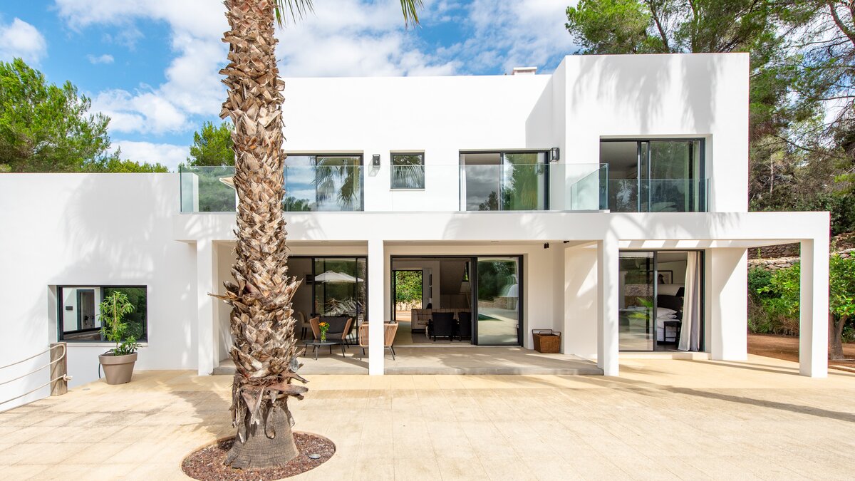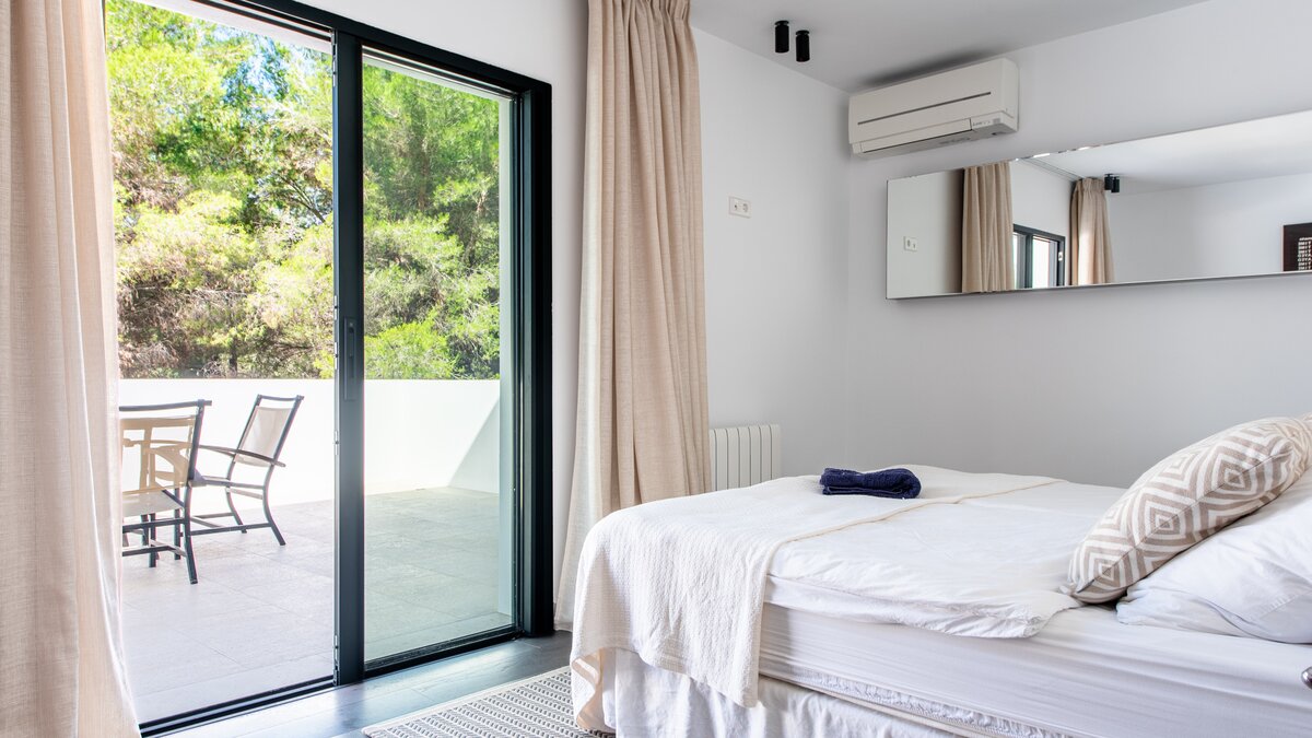 Die Liebe zum Detail macht dieses Haus zu einem sehr angenehmen, komplett renovierten Zuhause; Die Schlafzimmer und Bäder sind alle neu und außergewöhnlich groß für Ibiza-Verhältnisse. Deren Küche, die ebenfalls brandneu ist, ist mit allem ausgestattet, um jeden Tag für kleine und große Gruppen kochen zu können. Es gibt insgesamt 3 Wohnzimmerbereiche im Haus, so dass es auch für große Gruppen sehr einfach ist, Privatsphäre zu finden oder Zeit miteinander zu verbringen. Der Haupthaus hat zwei Stockwerke. Im sehr hellen Erdgeschoss befindet sich die Küche mit einem angeschlossenen großen Essbereich, 2 Wohnzimmer mit Sofas, die Platz für 10 Personen bieten. Einer von ihnen ist auch mit einem Smart-TV ausgestattet. Auf der anderen Seite des Wohnzimmers befindet sich ein großes Schlafzimmer mit separatem Bad, das eine Badewanne und eine ebenerdige Dusche bietet. Im ersten Stock befindet sich ein weiteres Wohnzimmer – mit einem herrlichen Blick auf das Anwesen und Ibiza-Stadt mit dem Schloss von Ibiza im Hintergrund. An einem klaren Tag kann man sogar Formentera sehen. Auf der linken Seite gelangt man in ein großes Schlafzimmer mit eigenem Bad, mit Badewanne und separater Dusch- und begehbarem Kleiderschrank. Auf der rechten Seite befinden sich zwei weitere Schlafzimmer mit eigenem Bad, jeweils mit begehbaren Duschen. Beiden Schlafzimmer teilen sich eine große Terrasse, die mit einem motorisierten Schiebedach überdacht werden kann. Von dort aus kann man auch Ibiza-Stadt sehen und einen Blick auf das Meer werfen. Das Gästehaus, intern durch einen separaten Eingang verbunden, besteht aus einem sehr großen Zimmer mit einem Doppelbett und einer Sitzecke, einem Bad mit Dusche und direktem Zugang zum Garten.