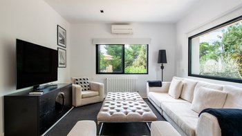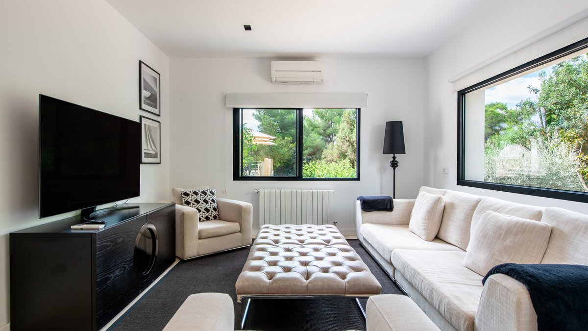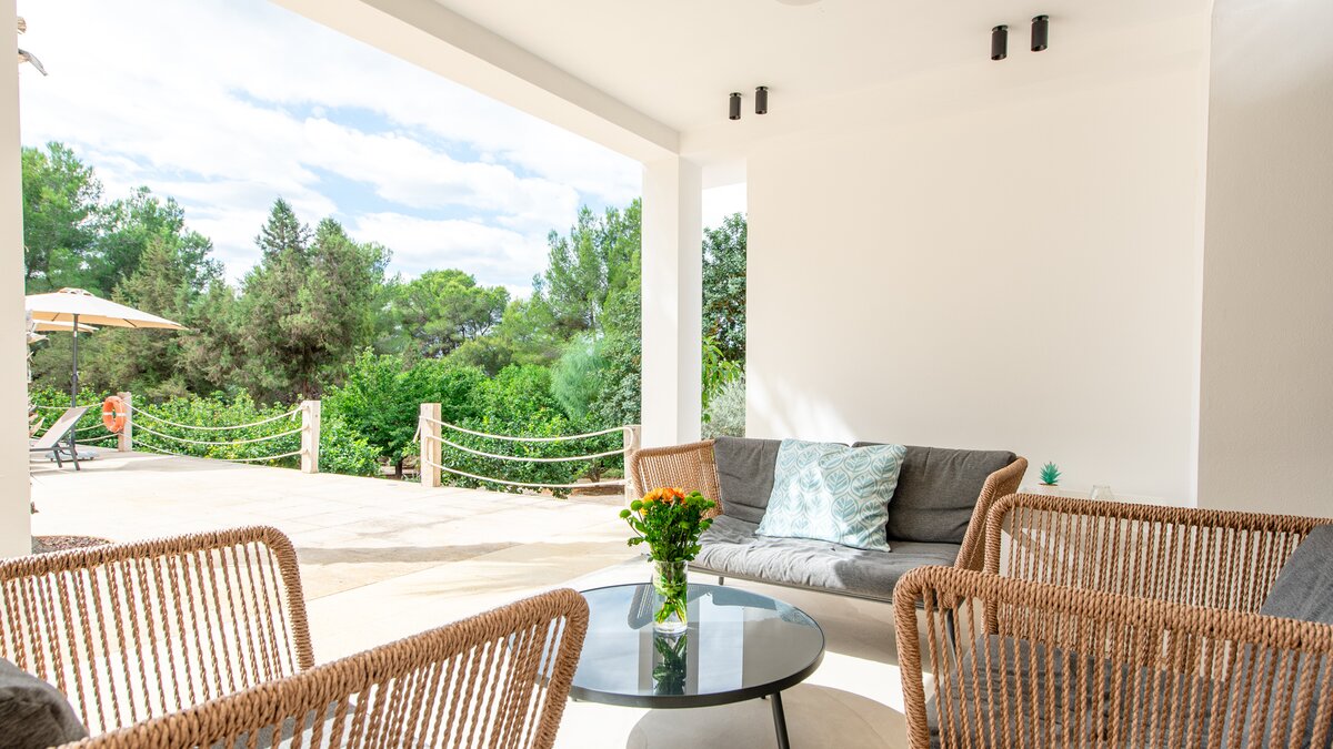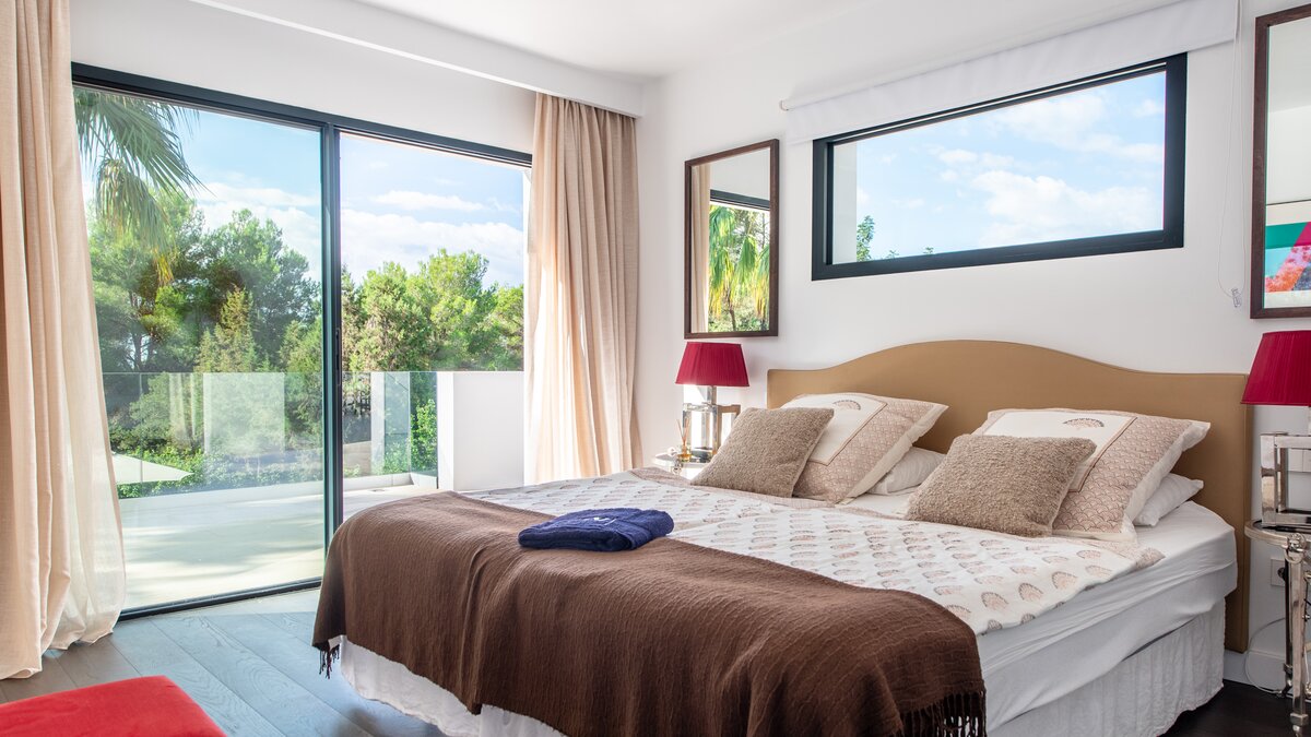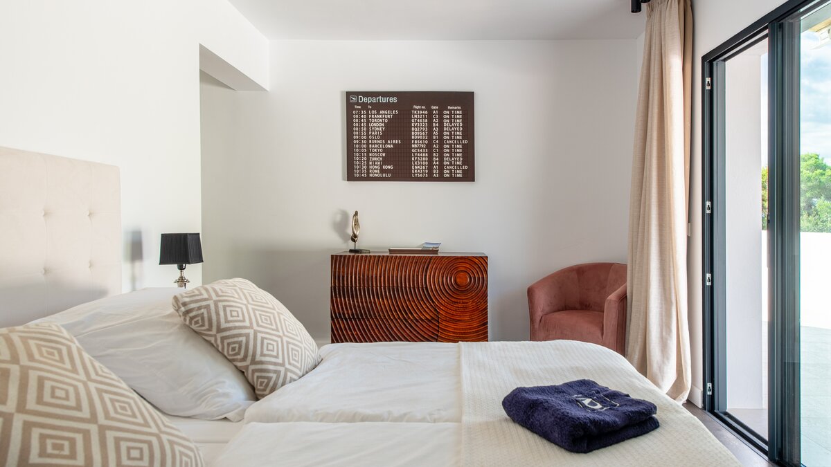 Die Liebe zum Detail macht dieses Haus zu einem sehr angenehmen, komplett renovierten Zuhause; Die Schlafzimmer und Bäder sind alle neu und außergewöhnlich groß für Ibiza-Verhältnisse. Deren Küche, die ebenfalls brandneu ist, ist mit allem ausgestattet, um jeden Tag für kleine und große Gruppen kochen zu können. Es gibt insgesamt 3 Wohnzimmerbereiche im Haus, so dass es auch für große Gruppen sehr einfach ist, Privatsphäre zu finden oder Zeit miteinander zu verbringen. Der Haupthaus hat zwei Stockwerke. Im sehr hellen Erdgeschoss befindet sich die Küche mit einem angeschlossenen großen Essbereich, 2 Wohnzimmer mit Sofas, die Platz für 10 Personen bieten. Einer von ihnen ist auch mit einem Smart-TV ausgestattet. Auf der anderen Seite des Wohnzimmers befindet sich ein großes Schlafzimmer mit separatem Bad, das eine Badewanne und eine ebenerdige Dusche bietet. Im ersten Stock befindet sich ein weiteres Wohnzimmer – mit einem herrlichen Blick auf das Anwesen und Ibiza-Stadt mit dem Schloss von Ibiza im Hintergrund. An einem klaren Tag kann man sogar Formentera sehen. Auf der linken Seite gelangt man in ein großes Schlafzimmer mit eigenem Bad, mit Badewanne und separater Dusch- und begehbarem Kleiderschrank. Auf der rechten Seite befinden sich zwei weitere Schlafzimmer mit eigenem Bad, jeweils mit begehbaren Duschen. Beiden Schlafzimmer teilen sich eine große Terrasse, die mit einem motorisierten Schiebedach überdacht werden kann. Von dort aus kann man auch Ibiza-Stadt sehen und einen Blick auf das Meer werfen. Das Gästehaus, intern durch einen separaten Eingang verbunden, besteht aus einem sehr großen Zimmer mit einem Doppelbett und einer Sitzecke, einem Bad mit Dusche und direktem Zugang zum Garten.