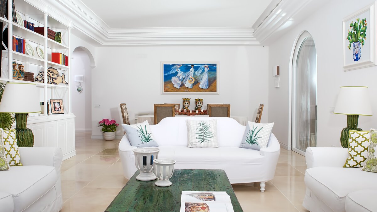 Im Inneren der Villa strahlt der offene Wohn- und Essbereich Eleganz aus und verfügt über einen komfortablen Sitzbereich mit drei stilvollen Sofas, die nahtlos in einen großen Esstisch übergehen, der sich perfekt für Geselligkeit eignet. Dessen offenes Design verstärkt das Gefühl von Raum und Licht und schafft eine einladende Atmosphäre, die sich ideal für Familienfeiern eignet. Große Fenster bieten einen nahtlosen Zugang zur Außenterrasse, auf der die Gäste im Freien speisen oder einfach nur in der mediterranen Brise entspannen können, während sie die atemberaubende Umgebung genießen. Deren gut ausgestattete Küche mit modernen Geräten ermöglicht eine mühelose Zubereitung von Mahlzeiten und ist direkt mit der Terrasse verbunden, um eine unkomplizierte Unterhaltung im Freien zu ermöglichen. Jeden Morgen wird den Gästen ein köstliches Frühstück mit frischem Gebäck, Obst der Saison und aromatischem Kaffee serviert. Jedes der sechs Schlafzimmer verfügt über ein eigenes Bad; drei im Obergeschoss bieten Zugang zu einer großzügigen Terrasse mit atemberaubendem Meerblick, während die beiden Schlafzimmer im Erdgeschoss auch Zugang zu einer Terrasse mit Meerblick haben.