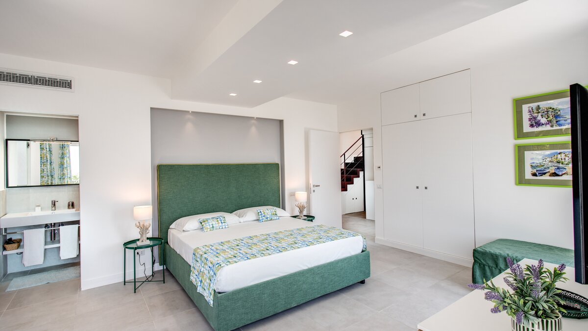 Im Inneren der Villa befindet sich ein heller, offener Wohn-/Küchenbereich, der sich perfekt zum Beisammensein eignet und hausgemachte Mahlzeiten genießt. Ein angrenzendes Schlafzimmer, das von der Terrasse aus zugänglich ist, verfügt über ein privates Schlafzimmer mit Doppelbett und eigenem Bad mit Dusche und Terrasse, von wo aus Sie einen Panoramablick auf das Meer genießen können. Auf der zweiten Etage befindet sich ein zusätzliches Schlafzimmer mit Doppelbett und eigenem Bad mit Dusche und Terrasse, das einen ruhigen Rückzugsort zum Entspannen bietet.