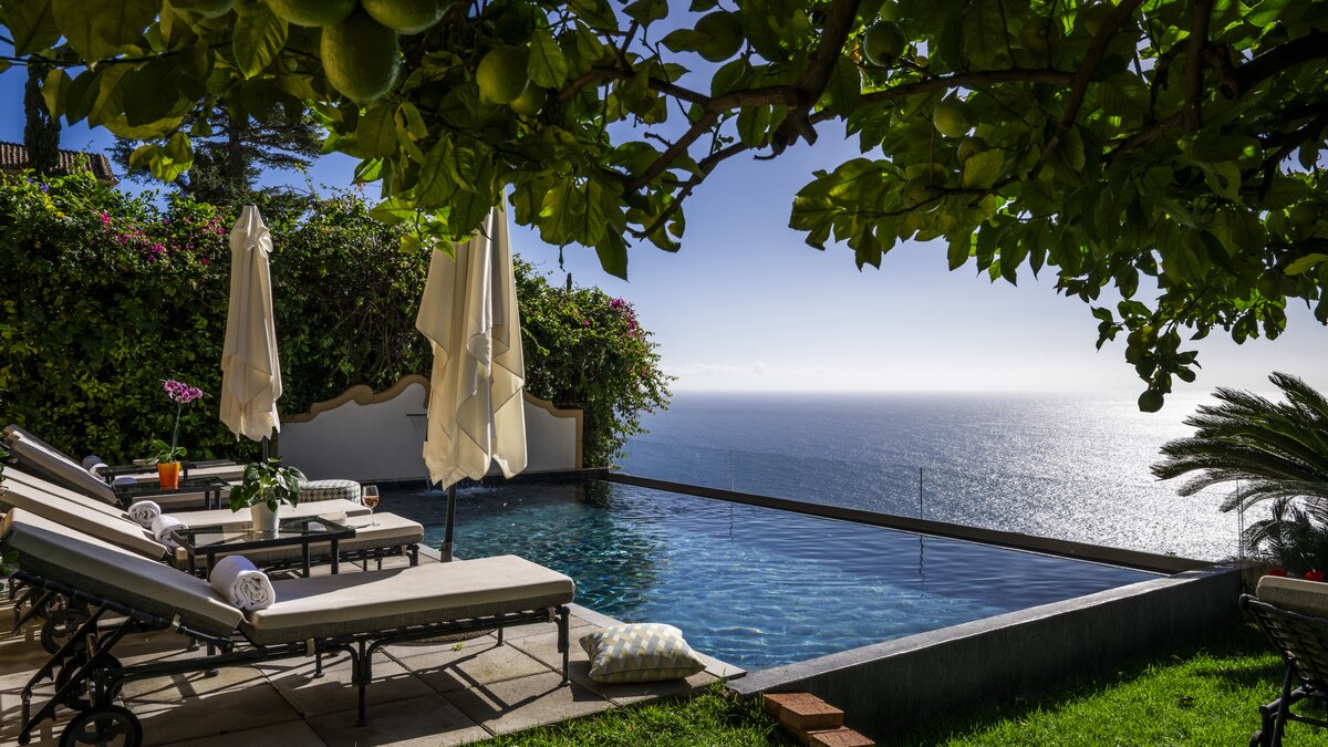 Eine voll ausgestattete Profiküche und ein entspanntes Esszimmer befinden sich auf der unteren Ebene, die natürlich auf die Terrasse führt. Etwas weiter unten liegt der Infinity-Pool mit Blick auf die Küste, mit einer großzügigen Sonnenterrasse und Heizung in den kühleren Monaten.