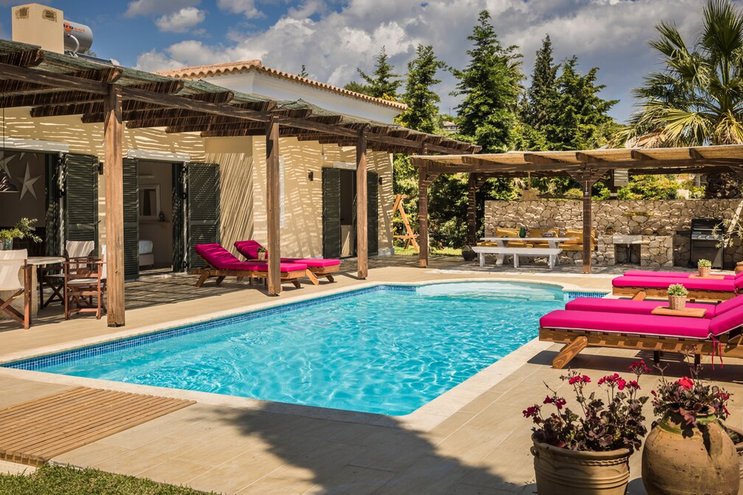Villa Chara ist eine charmante Villa mit vier Schlafzimmern in Kefalonia, Griechenland, in einer malerischen Umgebung, die sowohl das azurblaue Ionische Meer und auch den Berg Ainos überblickt.