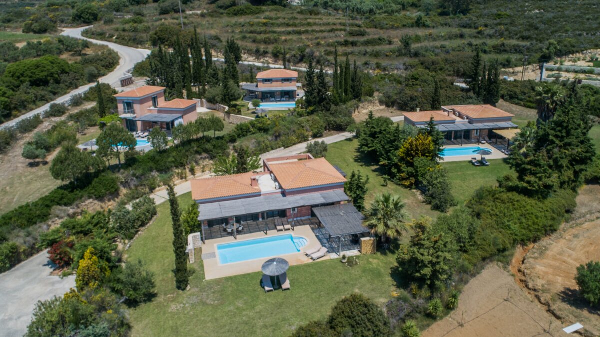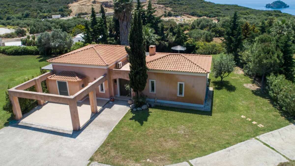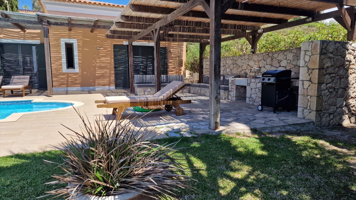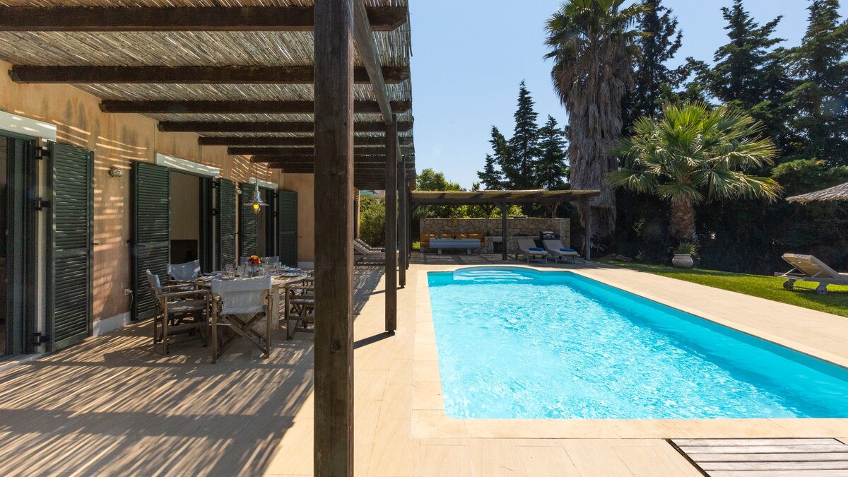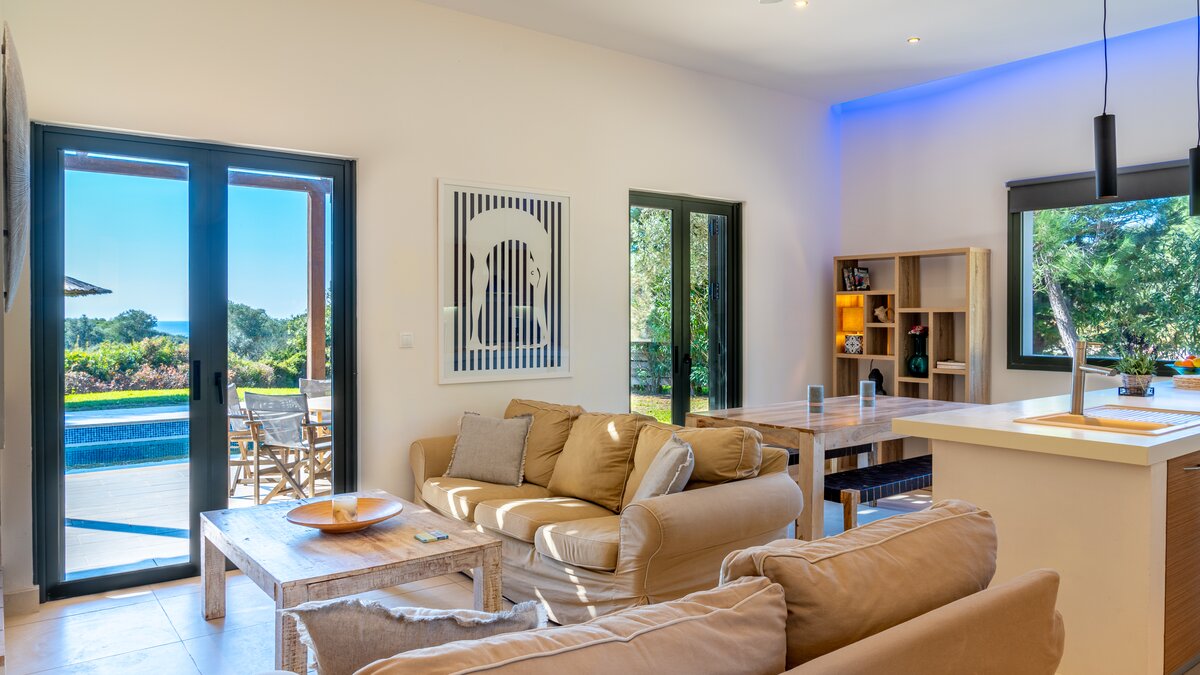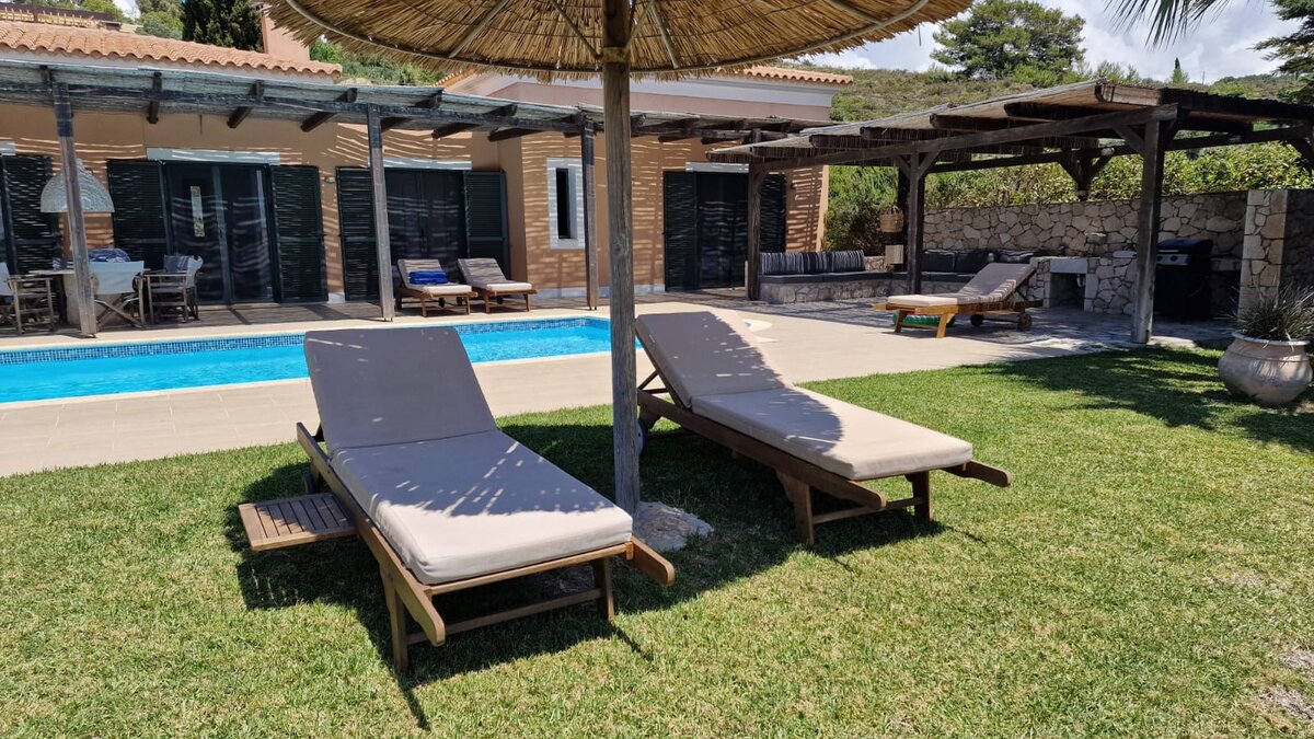 Moderne, komfortable und ruhige Lage in der Nähe des Meeres, ist dies eine schöne Familienvilla in Kefalonia. Ein ländlicher Rückzugsort für einen wirklich erholsamen Urlaub, ist es gleichermaßen attraktiv für zwei Paare. Klare Linien und kühle Farben tragen zum Gefühl der Geräumigkeit in dieser einstöckigen Villa bei, die von den jungen Athener Eigentümern wunderschön gestaltet wurde und mit hochwertigen Möbeln ausgestattet ist. Deren luftige Küche/Wohnzimmer der Villa öffnet sich auf eine schattige Veranda und einen Essbereich im Freien, und jedes der drei stilvoll aufgeräumten Schlafzimmer hat direkten Zugang zur Terrasse oder zum Garten. Die nach Süden ausgerichtete und sonnenverwöhnte Anlage ist sanft auf Rasen angelegt, umgibt einen einladenden Swimmingpool und blickt über ein grünes Tal auf das Meer und die vorgelagerte Insel Dias.