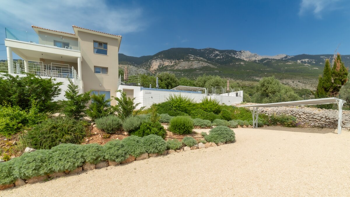 Villa Chara ist eine charmante Villa mit vier Schlafzimmern in Kefalonia, Griechenland, in einer malerischen Umgebung, die sowohl das azurblaue Ionische Meer und auch den Berg Ainos überblickt.
