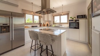 Die Villa verfügt über geräumige, lichtdurchflutete Innenräume mit minimalistischem Dekor und High-End-Möbeln. Große Glastüren öffnen sich auf weitläufige Terrassen, die nach draußen einladen und einen atemberaubenden Blick auf das Meer bieten. Der offene Grundriss Wohnbereich umfasst eine voll ausgestattete Küche, einen Essbereich und eine gemütliche Lounge, die sich perfekt zum Entspannen und Unterhalten eignet.