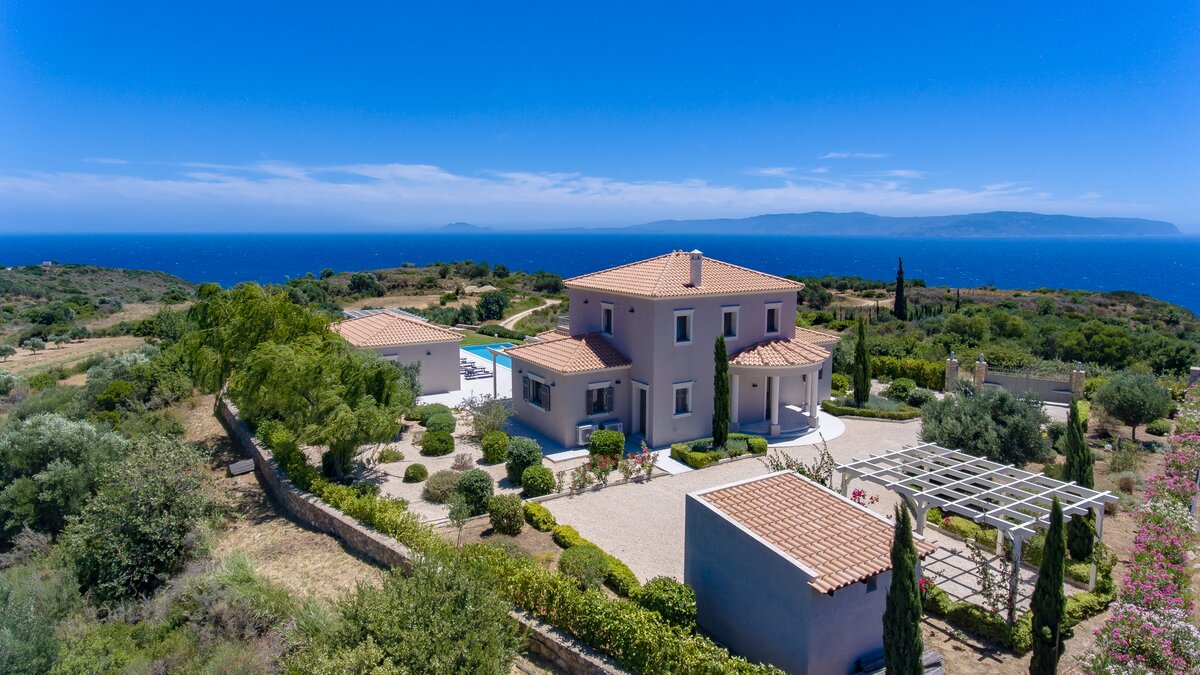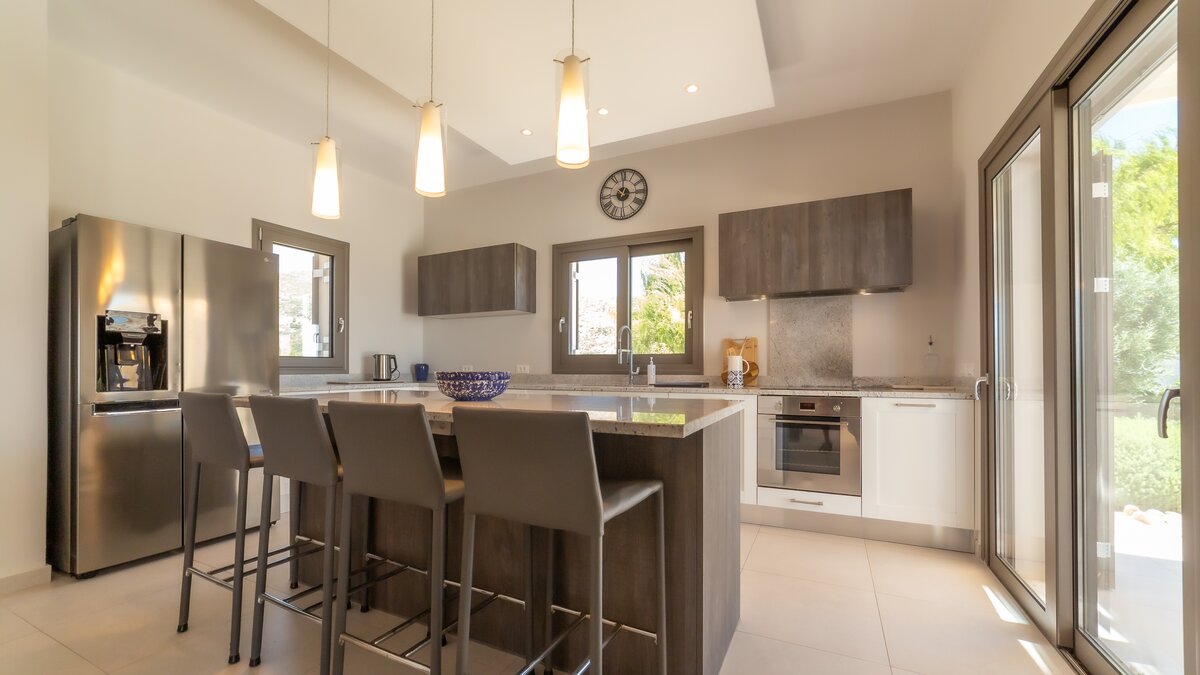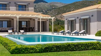 Bei der Ankunft werden die Gäste von üppig angelegten Gärten und einem großen Privatparkplatz begrüßt. Betreten Sie den Innenraum und entdecken Sie das helle, geräumige Interieur, in dem große Fenster und Glasschiebetüren die Wohnräume mit Tageslicht durchfluten und einen weiten Blick auf das Ionische Meer und die umliegende Landschaft bieten. Der offene Wohn- und Essbereich ist geschmackvoll eingerichtet mit bequemen Sofas und einem Esstisch für acht Personen, die einen einladenden Ort zum Entspannen und Unterhalten schaffen. Deren angrenzende Küche ist komplett mit modernen Geräten ausgestattet und eignet sich perfekt für die Zubereitung von Mahlzeiten für Mahlzeiten im Freien.