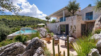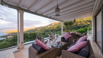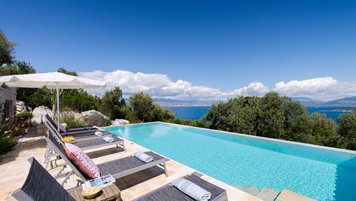 Diese luxuriöse Villa auf Korfu liegt auf einem Küstenhang mit Blick auf die Bucht von Kalamaki und ist von großen Landschaftsgärten umgeben. Von jedem Zimmer und von den möblierten Terrassen genießen Sie einen herrlichen Meerblick.