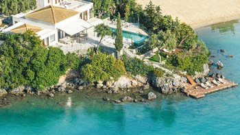 An der Spitze der Halbinsel Kommeno gelegen, bietet diese außergewöhnliche Villa direkt am Wasser einen hervorragenden Meerblick und viel Privatsphäre.