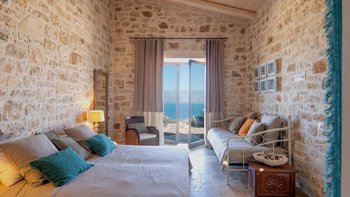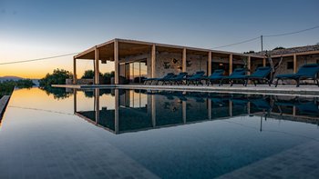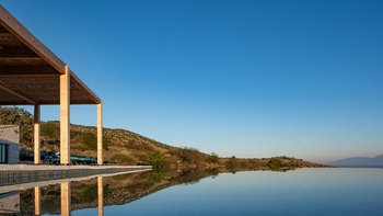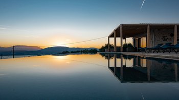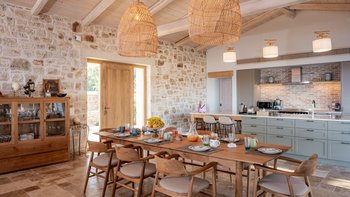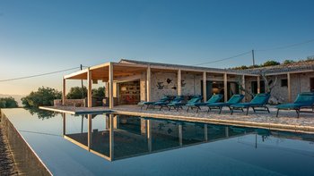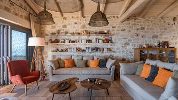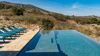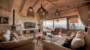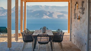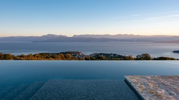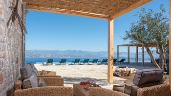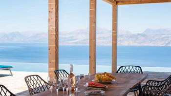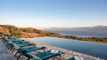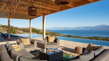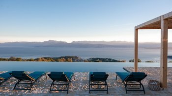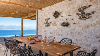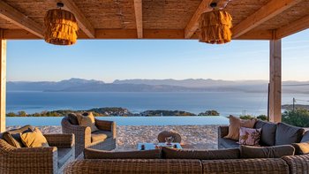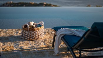 Im Außenbereich umschließt eine weitläufige Sonnenterrasse einen glitzernden Infinity-Pool, der mit dem Meer zu verschmelzen scheint. Dessen schattige Ess- und Loungebereiche bieten eine Auswahl an Plätzen zum Entspannen, egal ob Sie sich lieber in der Sonne sonnen oder sich mit einem Buch im kühlen Schatten zurückziehen möchten. Denen angelegten Gärten mit duftenden Kräutern und Olivenbäumen bieten den Rahmen für lange, faule Nachmittage und Abendessen im Freien unter dem Sternenhimmel.
