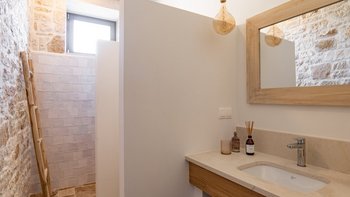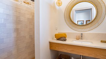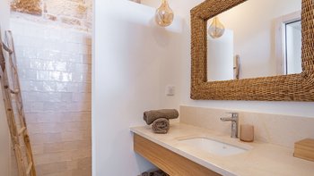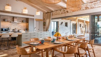 Das Herzstück der Villa ist der lichtdurchflutete, OFFENER GRUNDRISS Wohnbereich, in dem raumhohe Fenster die glitzernde Meereslandschaft umrahmen. Eine voll ausgestattete, moderne Küche fügt sich nahtlos in die Ess- und Sitzbereiche ein und schafft einen geselligen Ort für Familienfeiern oder lange, lange Abendessen. Dessen Innenräume sind durchdacht in neutralen Farbtönen, natürlichen Texturen und mediterranen Farbtupfern eingerichtet und strahlen dezenten Luxus aus.