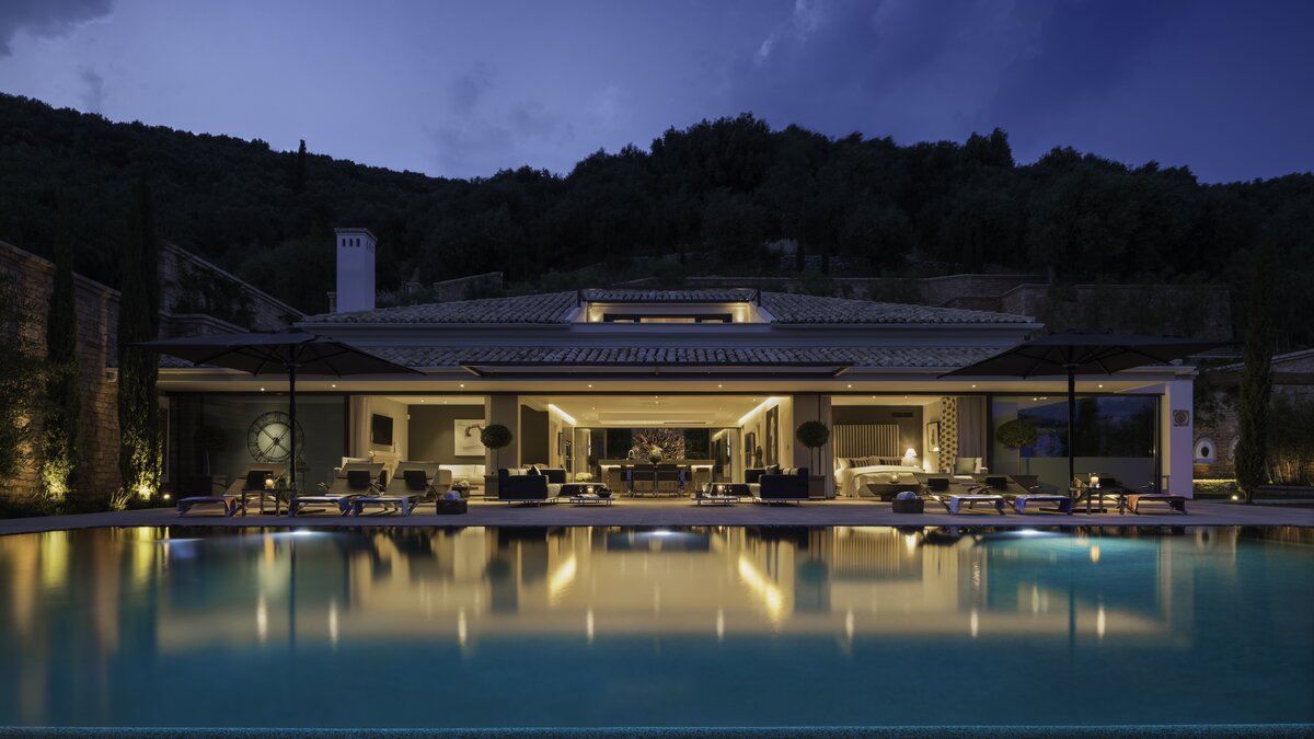 Alle Schlafzimmer im Erdgeschoss haben große Glastüren, die entweder zur Poolterrasse oder zum Innenhof führen. Deren erste Etage ist nur von der zweiten Master-Suite mit eigenem Balkon belegt. Draußen wird der wunderschöne PRIVATER POOL- und Terrassenbereich von einer sehr eleganten Bar und einer Außenküche bedient und von angelegten Gärten umgeben. Ein paar Stufen vom Pool entfernt führen zu einem weiteren Sitzbereich mit unglaublichem Meerblick, ideal für einen Sundowner. Ein gepflasterter Weg, der nachts beleuchtet ist, schlängelt sich durch das Gelände zu einer privaten Badeplattform, komplett mit Sonnenliegen und einfachem Zugang zum Wasser; Es gibt auch eine Landeplattform für Boote, so dass die Gäste einen Tag auf dem Wasser verbringen und direkt zurück zur Villa gebracht werden können. In der Nähe gibt es einige schöne Kiesstrände, und San Stephano und Kassiopi sind nur eine kurze Autofahrt entfernt.