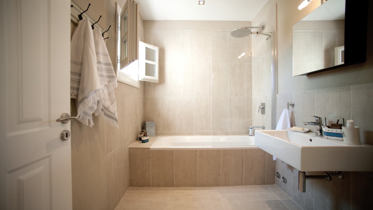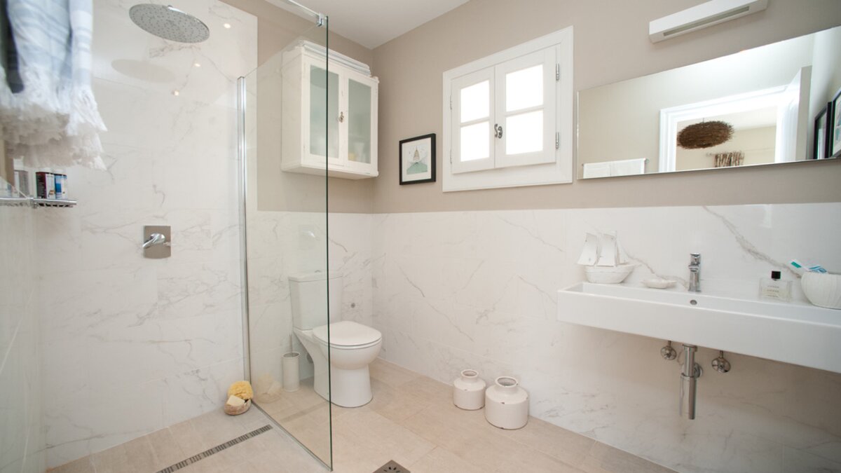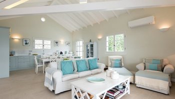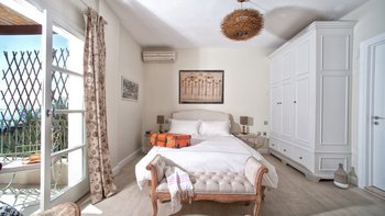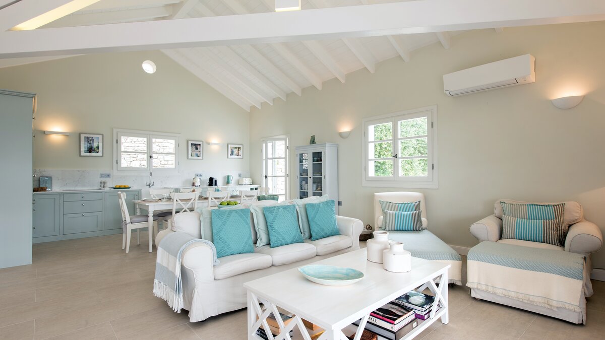 Der Eingang der Villa befindet sich im Erdgeschoss und führt in das große Wohnzimmer, den Essbereich und die Küche. Dieser offene Raumaufteilung verleiht der Villa ein großzügiges Ambiente, das durch den Blick auf das Meer und die angrenzende möblierte Terrasse noch besser wird. Der Wohnbereich mit Weißfokus wurde stilvoll in beruhigenden Aqua-, Grau- und Weißtönen eingerichtet, und es gibt einen großen Esstisch für 8 Personen. Dessen neu installierte und gut ausgestattete Küche ist handbemalt in Farrow und Ball hellblau und ergänzt das stilvolle Wohninterieur mit einer hellen Quarz-Arbeitsplatte und neuen, hochwertigen Geräten. Ein großzügiges Schlafzimmer mit Doppelbett vervollständigt das Erdgeschoss und verfügt über einen großen Kleiderschrank, eine stilvolle Chaiselongue und ein luxuriös begehbares Duschbad. Denen Türen vom Schlafzimmer führen auch auf die Terrasse am Meer. Eine Treppe führt hinunter in das untere Erdgeschoss der Villa, wo sich zwei weitere geräumige Schlafzimmer befinden. Dessen großes, in elegant neutralen Farbtönen gehaltenes Doppelzimmer verfügt über ein eigenes Bad mit Dusche, während das großzügige Zweibett-Schlafzimmer über ein eigenes Bad und ein zusätzliches Schlafsofa (nur für Kinder) verfügt. Beiden Zimmer sind wunderschön gestaltet, mit französischen Fenstern, die auf die Poolterrasse der Villa führen. Aller drei Schlafzimmer bieten einen atemberaubenden Meerblick.