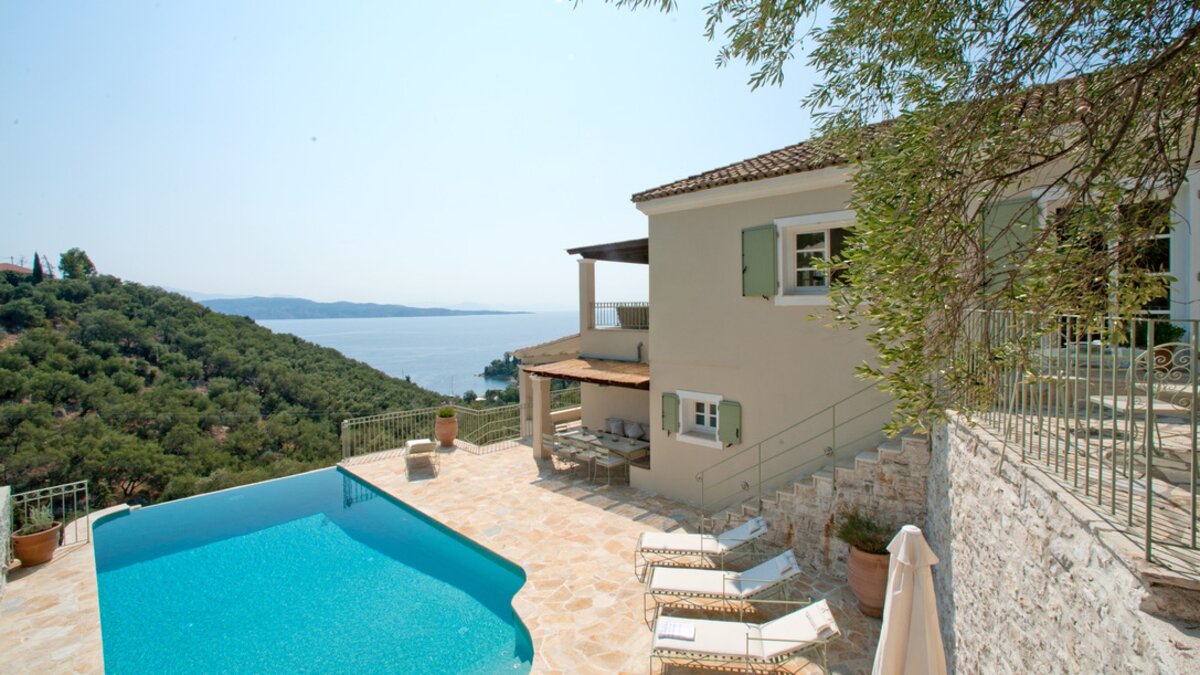 Große Tavernen, preiswerte Bootsverleihe und der hübsche kleine Kieselstrand bei Agni sind alle nur wenige Schritte von diesem klassischen Haus an der Nordostküste Korfus entfernt. Auf einem baumbestandenen Hügel gelegen, bietet Nicoletta einen atemberaubenden Blick auf das Ionische Meer – jeder Ort der Entspannung sonnt sich in der Aussicht, aber sie sind besonders durch den Infinity-Pool und die umliegende Terrasse gekennzeichnet. Dieses Drei-Bett-Haus hat einen entspannten Charme, der Sie sofort in eine einladende Atmosphäre wie zu Hause einhüllt. Dessen Haus wurde in einem modernen korfiotischen Design erbaut und nutzt das natürliche Licht der Insel mit geräumigen Innenräumen, klassisch weißem Dekor und großen französischen Fenstern, die die Aussicht genießen. Malerische apfelgrüne Fensterläden tragen zusammen mit der mit Stein übersäten Poolterrasse und wunderschönen überdachten Terrassen zum Charme des Äußeren bei.