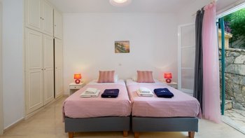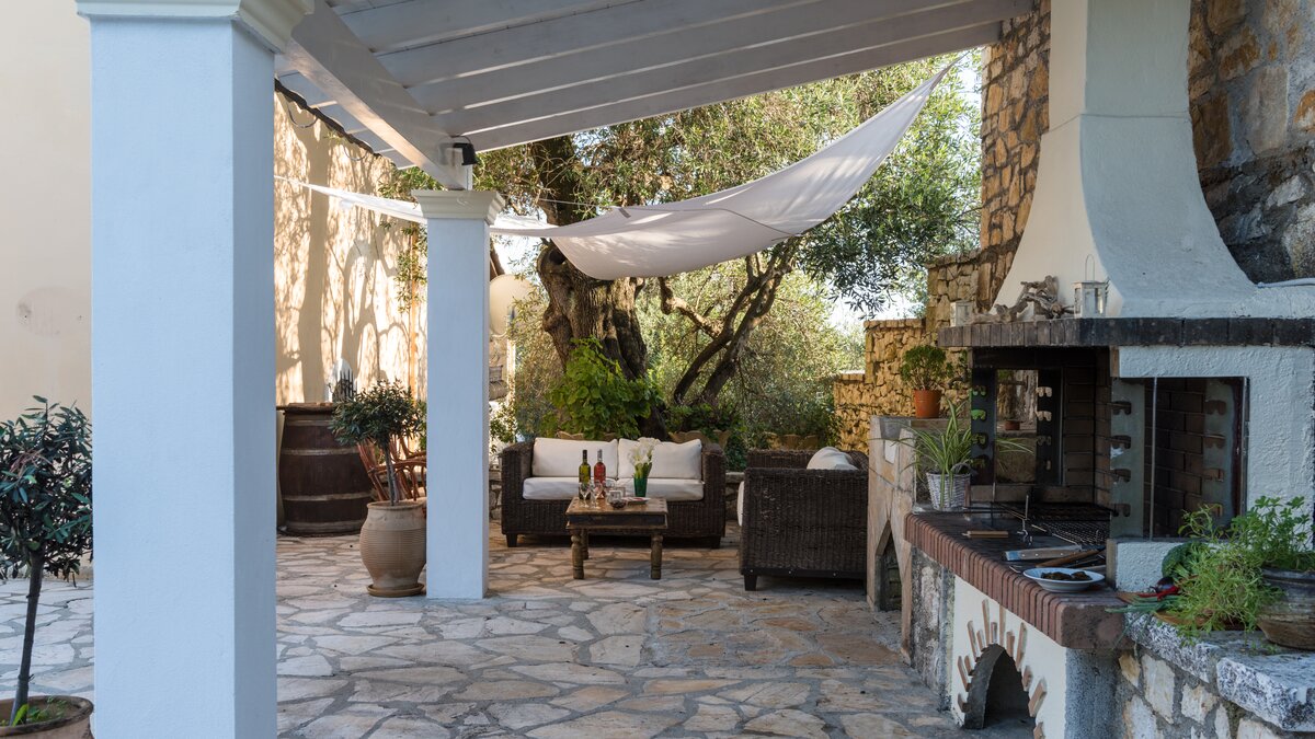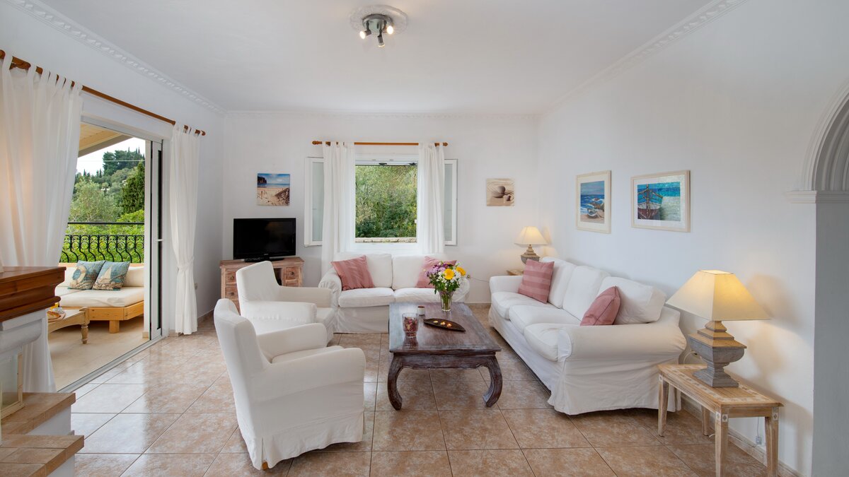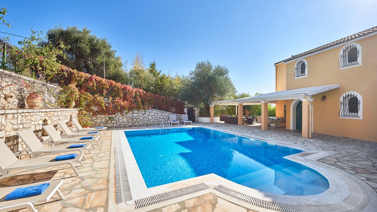 Ein traditionelles korfiotisches Landhaus, in herrlicher Nähe zum Meer, ist diese entspannende Villa in einem ruhigen Inseltempo eingehüllt. Innerhalb des Hauses ist die Unterkunft großzügig bemessen und einfach für Komfort eingerichtet. Im Erdgeschoss ist das geräumige Wohn-/Esszimmer kühl und hell, mit frischem weißem Dekor und Türen zu einer Terrasse im Freien. Deren obere Etage ist eine private Oase für das Schlafzimmer mit Doppelbett, das sich auf einen großen Balkon mit gepolsterten Sitzgelegenheiten und herrlicher Aussicht öffnet; während drei Zweibett-Schlafzimmer das untere Erdgeschoss einnehmen.  Im Außenbereich gibt es mehrere Terrassen, die fast von morgens bis abends die Sonne einfangen, eine schöne Veranda, die natürlich in üppigem Grün abgeschirmt ist und zum Entspannen und Essen eingerichtet ist, eine ummauerte und sonnenverwöhnte Terrasse umschließt den acht Meter langen Swimmingpool und ein Grillplatz ist vom Haus aus leicht zu erreichen. Ein Pfad vom Garten führt hinunter zu einer Badeplattform auf der rechten Seite des Meeres, wo Olympia sich das Wasser mit der Schwestervilla Gallini teilt. Der Strand von Kerasia und der Hafen von St. Stephano sind beide leicht zu Fuß erreichbar.