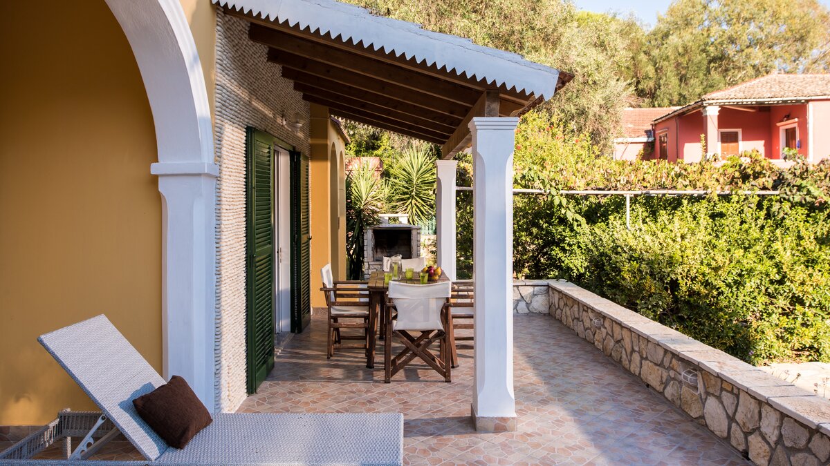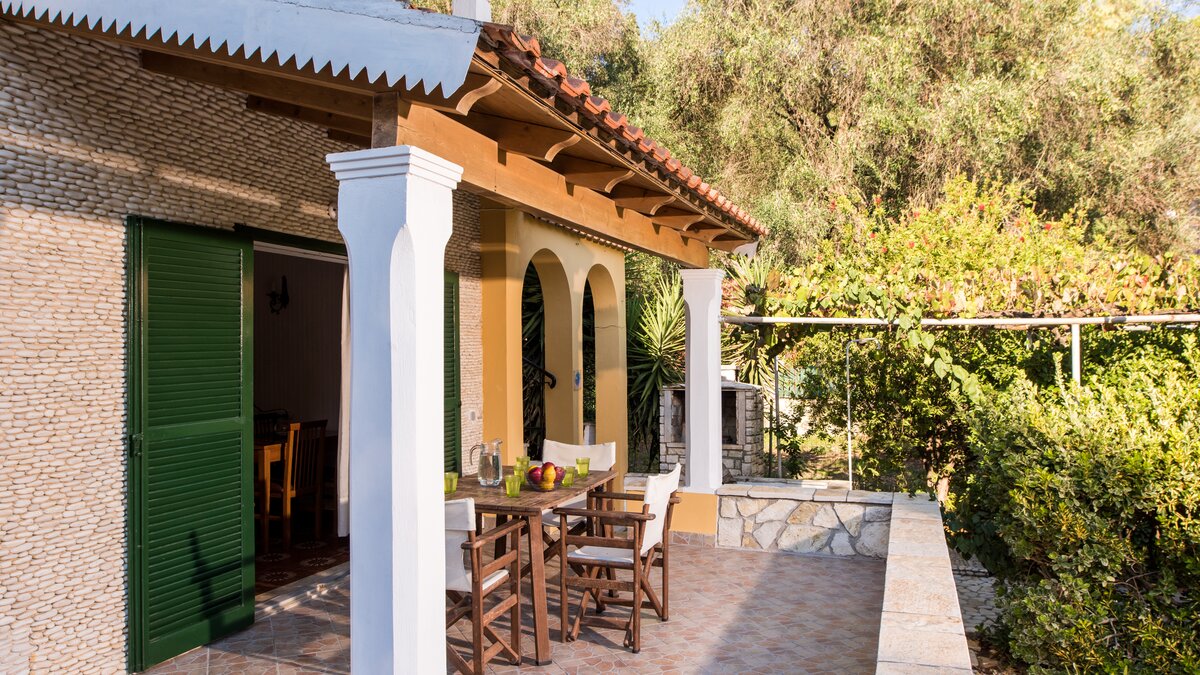 Perfekt gelegen und immer beliebt, führt in dieser Familienvilla auf Korfu ein Pergola-Schattenweg zum Gartentor, das sich direkt zum glitzernden Kieselstrand von Kerasia öffnet.