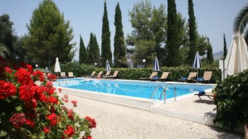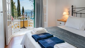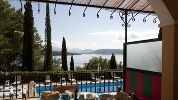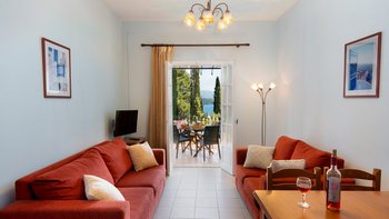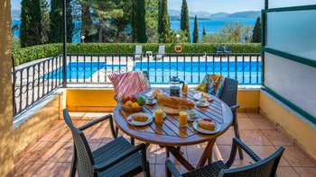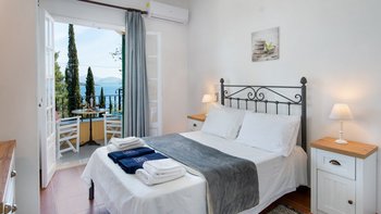 Dieses Familienapartment auf Korfu mit Blick auf den Pool, mit verlockendem Blick auf die Bucht zwischen den Bäumen, ist Teil der freundlichen und gut gelegenen Villa Kasomitria.