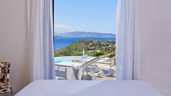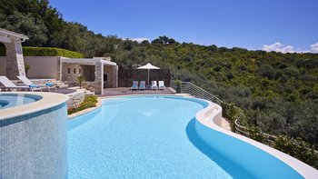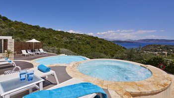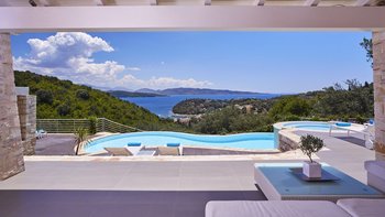 Diese stilvolle und anspruchsvolle Villa mit vier Schlafzimmern auf Korfu verspricht einen atemberaubenden Panoramablick von einer privaten Hangoase.