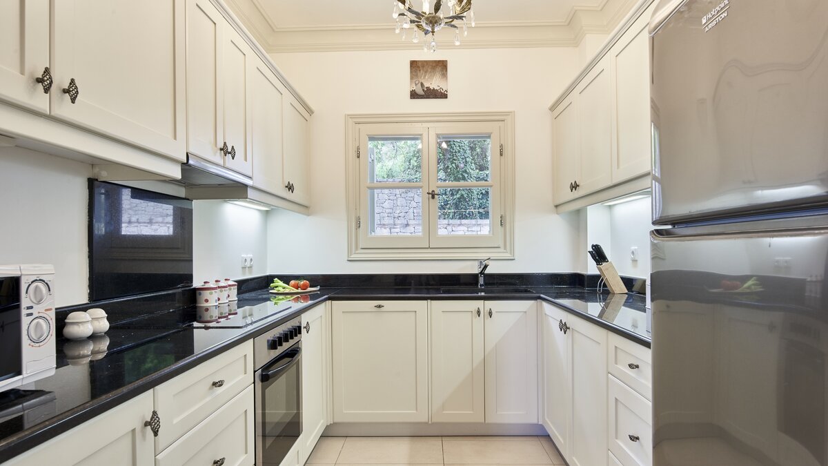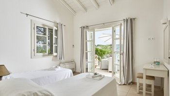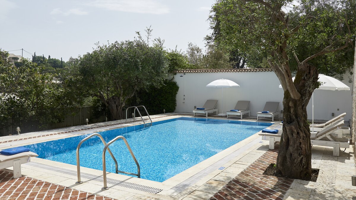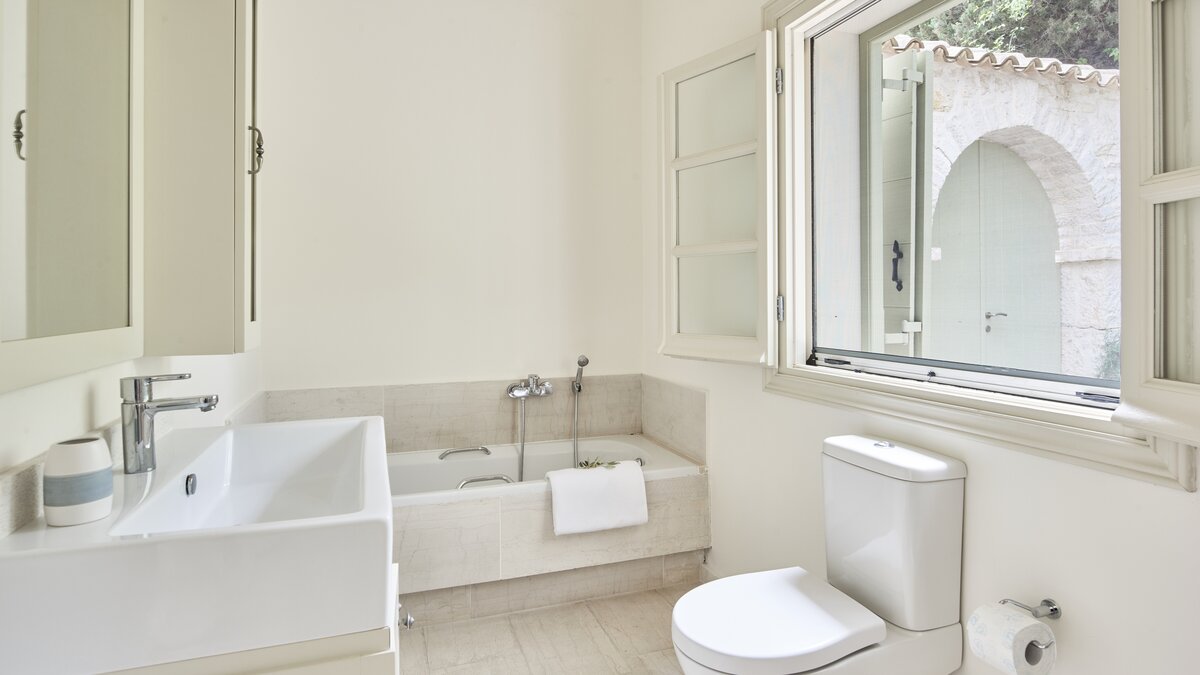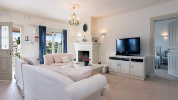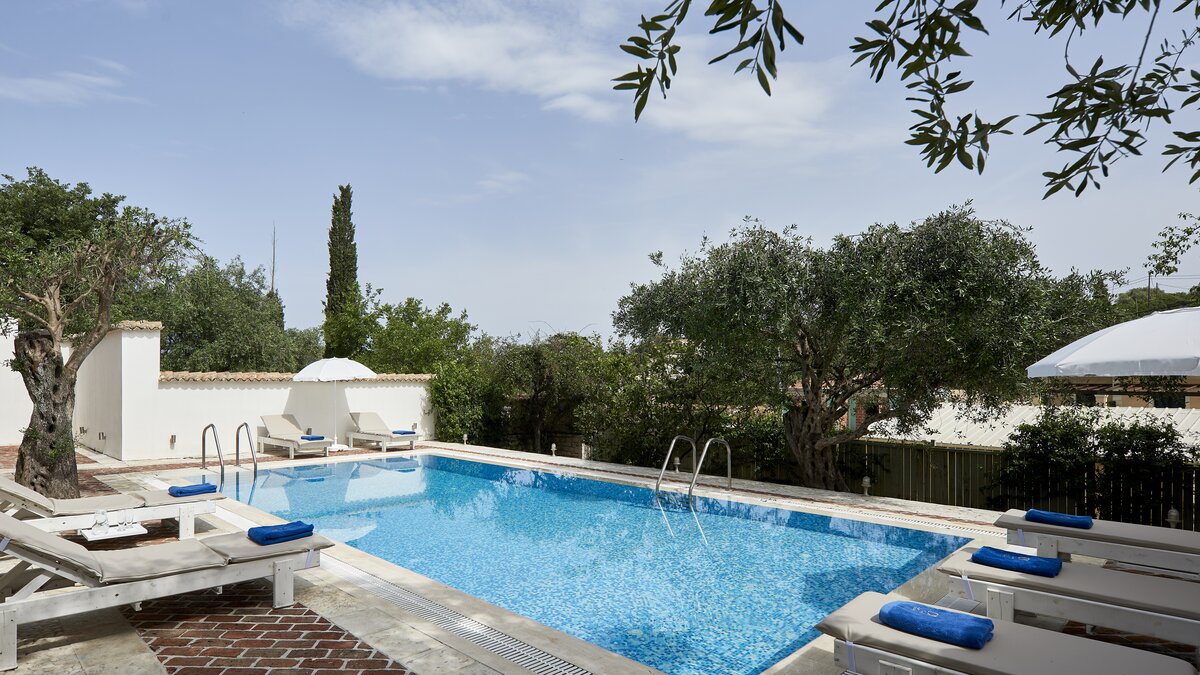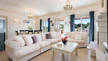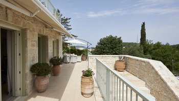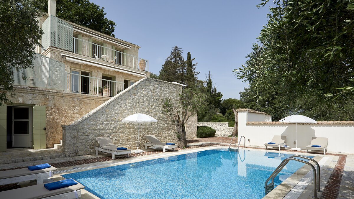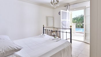 Auf dieser Ebene gibt es auch eine gut ausgestattete Küche sowie einen offenen Ess- und Sitzbereich mit Zugang zu einer möblierten Terrasse im Freien. Eine Steintreppe führt hinunter zu einer den Pool umgebenden Terrasse mit direktem Zugang zu einem Zweibett-Schlafzimmer mit Dusche en suite. Dessen geräumige Hauptschlafzimmer hat auch Zugang zu einem eigenen Bad mit separater Duschkabine. Dieses komfortable Anwesen ist nur einen kurzen Spaziergang vom florierenden Hafen von Kassiopi und seinen beliebten Stränden entfernt. Dessen Villa Cassia ist ebenerdig mit ihrem Schwesterhaus verbunden, behält jedoch ihre eigene Privatsphäre.