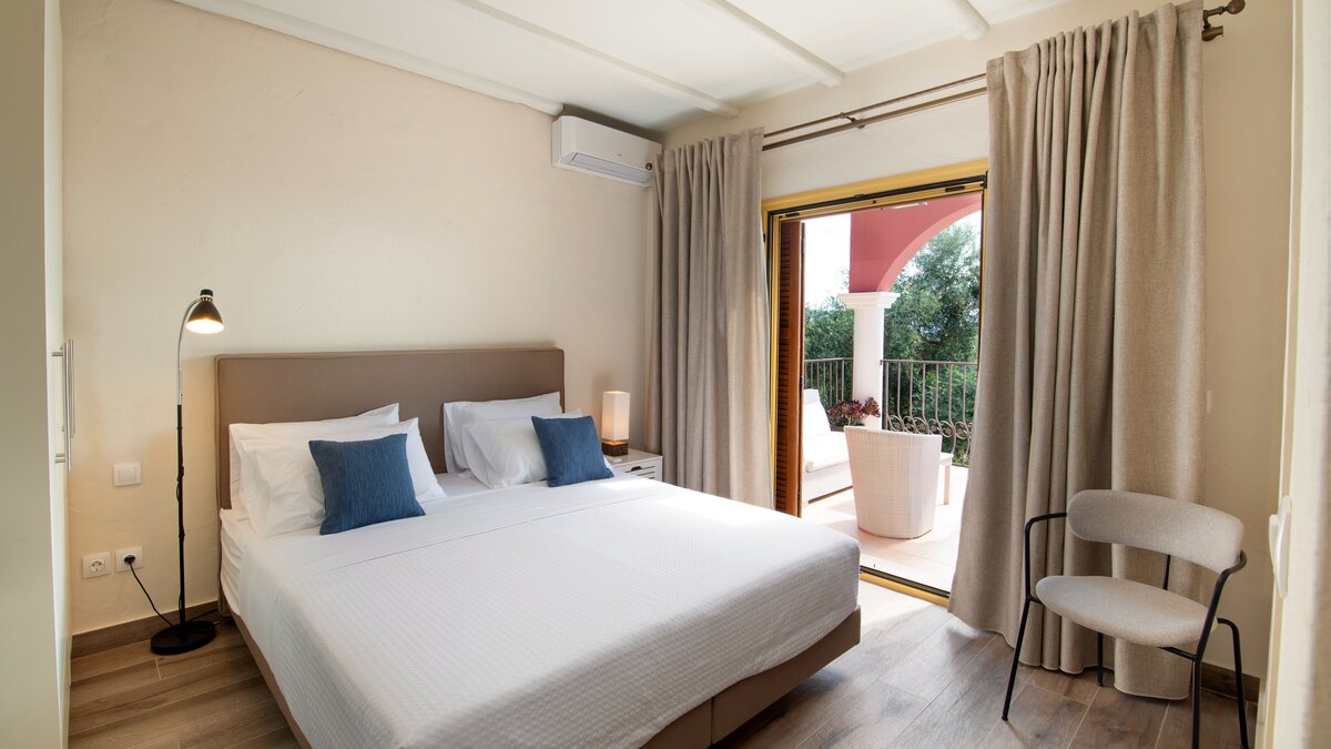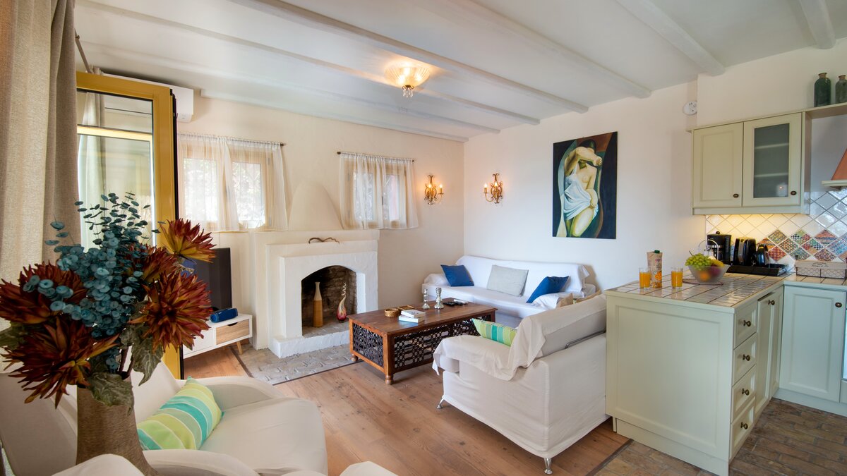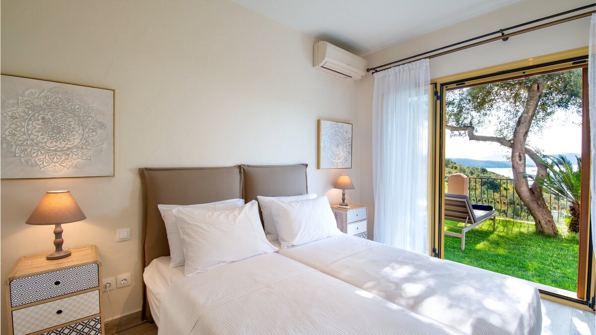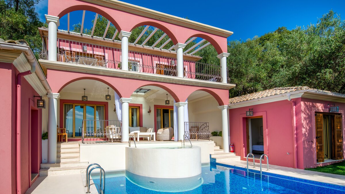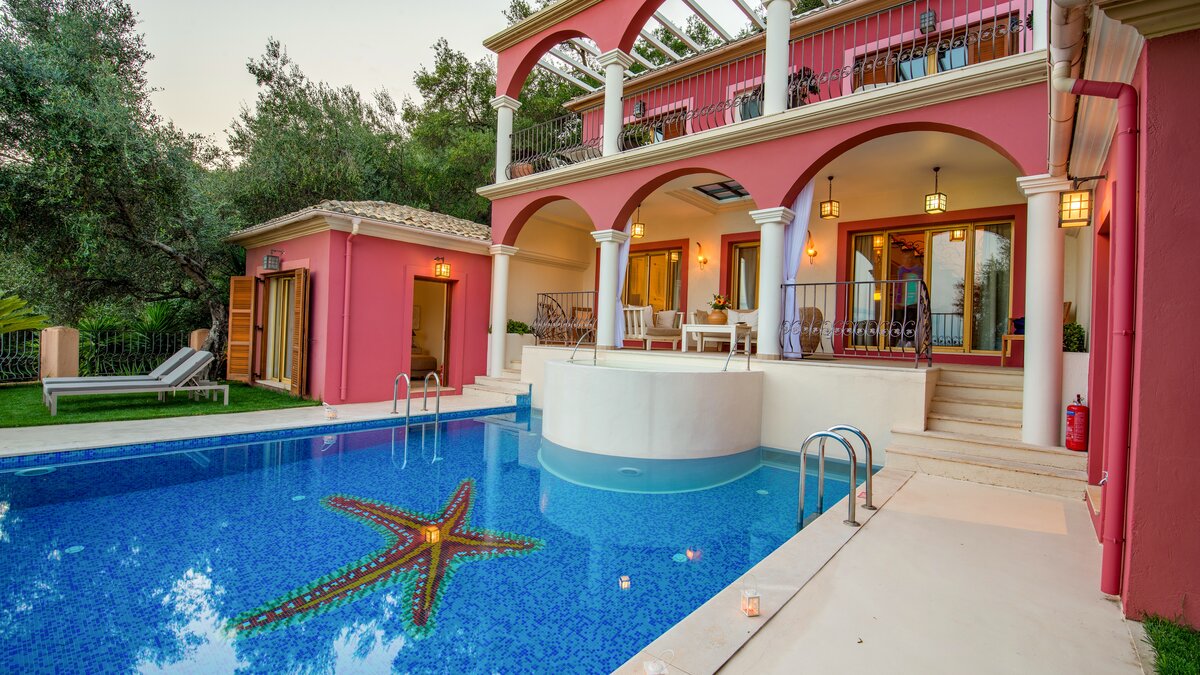 In einer begehrten Lage befindet sich diese elegante Villa in den Hängen oberhalb von St. Stephano, ruhig gepolstert zwischen alten Bäumen und dennoch in der Nähe des hübschen Hafendorfes darunter. Villa Felicia hebt sich mit ihren purpurroten Wänden, Säulenterrassen und Mosaik-Infinity-Pool und Jacuzzi von der Masse ab. Im Inneren hingegen ist sie in neutralen Farbtönen gehalten und bietet ein minimalistisches, modernes Ambiente. Dessen offene Küche/Esszimmer der Villa ist durchgehend klimatisiert und befindet sich auf einer erhöhten Ebene mit Türen zu einer Terrasse im Freien mit Blick auf die wunderschöne Bucht. Unten, auf beiden Seiten des Pools – ideal für ein morgendliches Bad – sind zwei Doppelschlafzimmer jeweils nur vom Garten aus zugänglich. Die oberste Etage des Hauses teilt sich ein drittes Schlafzimmer mit Doppelbett und die Master-Suite, die sich auf einen Balkon mit herrlicher Aussicht öffnet. Draußen führen gepflasterte Wege durch Rasengärten zu einem Speisesaal unter den Bäumen. Denen Geschäften, dem Strand und den Tavernen am Hafen von St. Stephano sind nur 10 Minuten zu Fuß über einen schattigen, unebenen Weg oder eine kurze Autofahrt entfernt.