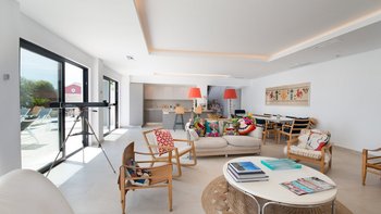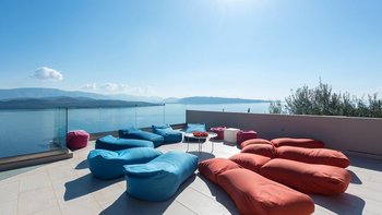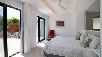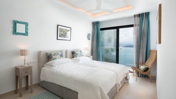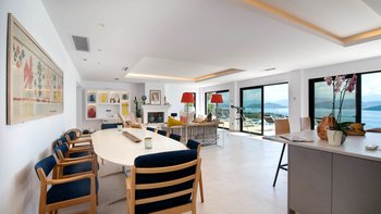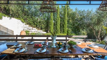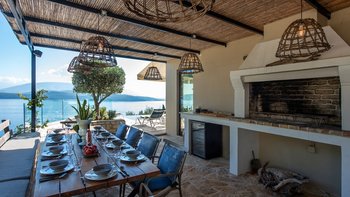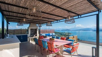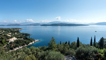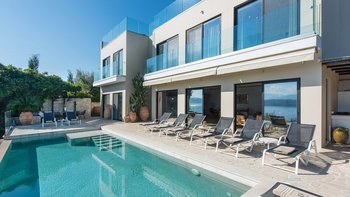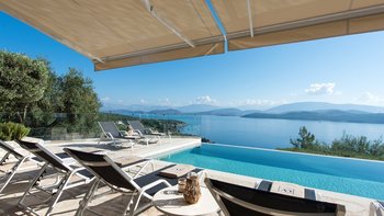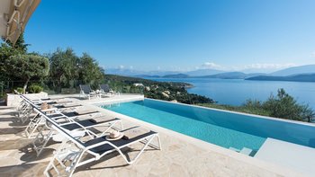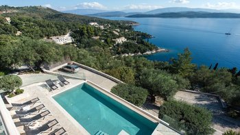 Die Villa Kyvos wurde durchdacht mit Blick auf die Aussicht entworfen und bietet einen atemberaubenden Blick über das Meer bis nach Albanien von fast überall im Haus. Nur einen kurzen Spaziergang vom exklusiven St. Stephano mit seiner Auswahl an ausgezeichneten Tavernen sowie dem schönen Kieselstrand von Kerasia entfernt, ist diese moderne Luxusvilla perfekt für einen erholsamen Urlaub und gut ausgestattet für Unterhaltung. Im Erdgeschoss befinden sich die moderne Küche und der Wohn-/Essbereich, die in einem eklektischen zeitgenössischen Stil eingerichtet sind, und öffnen sich zum schillernden Infinity-Pool und der umlaufenden Terrasse, die zu einem Esstisch mit Grillplatz führt. Ebenfalls auf dieser Etage befindet sich das Hauptschlafzimmer mit Zugang zur Terrasse und mit Bad en suite. Es gibt vier Schlafzimmer im ersten Stock, ein Doppel- und drei Zweibett-Schlafzimmer, alle mit Duschen en Suite und separaten WCs en Suite. Jedes Zimmer auf dieser Etage hat Blick auf das Meer und jedes hat Zugang zu einem kleinen Balkon. Ein echtes Highlight ist die spektakuläre Dachterrasse mit Panoramablick entlang der Küste, einer gut ausgestatteten Sommerküche und einem schönen schattigen Essbereich, um bei Sonnenuntergang das Abendessen zu genießen.