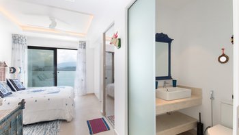In der perfekten Lage zwischen St. Stephano und Kerasia bietet die Villa Kyvos einen atemberaubenden Blick auf das Meer, eine coole, moderne Inneneinrichtung und eine Dachterrasse mit Panoramablick, ideal für Unterhaltung mit Familie und Freunden.