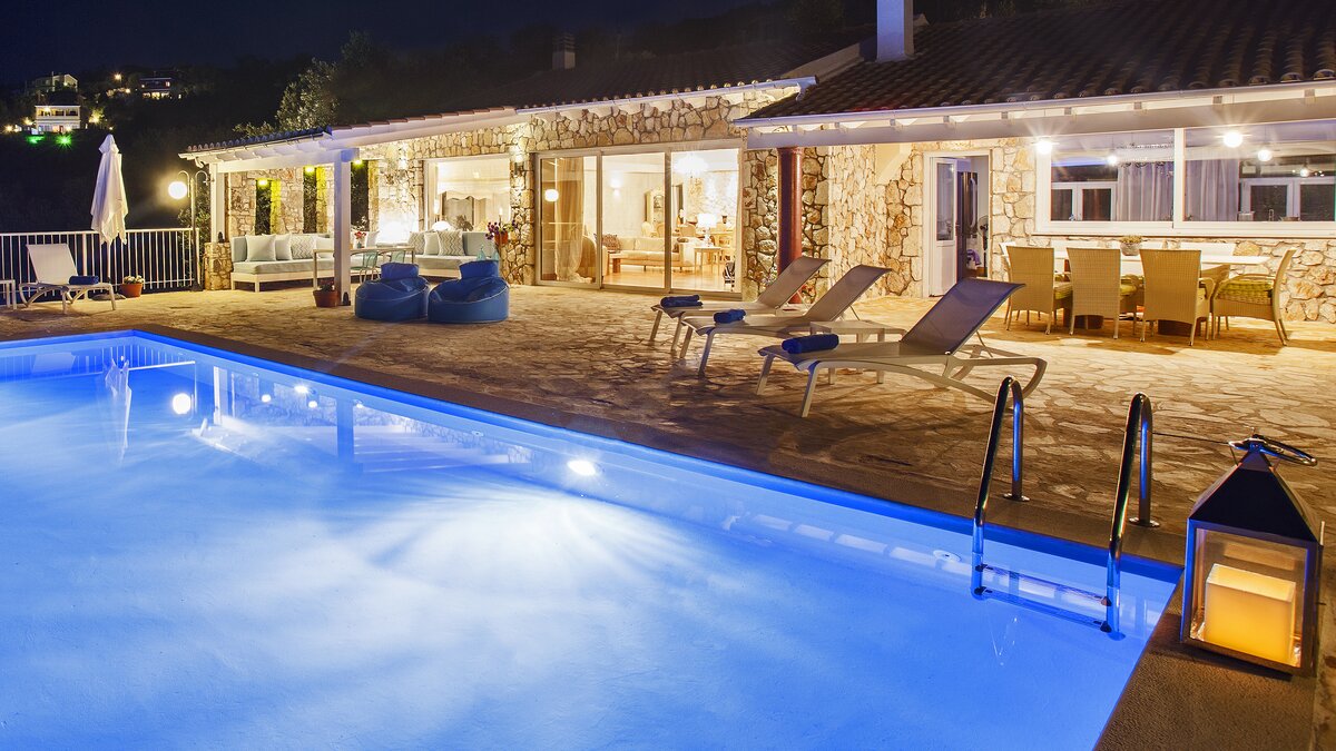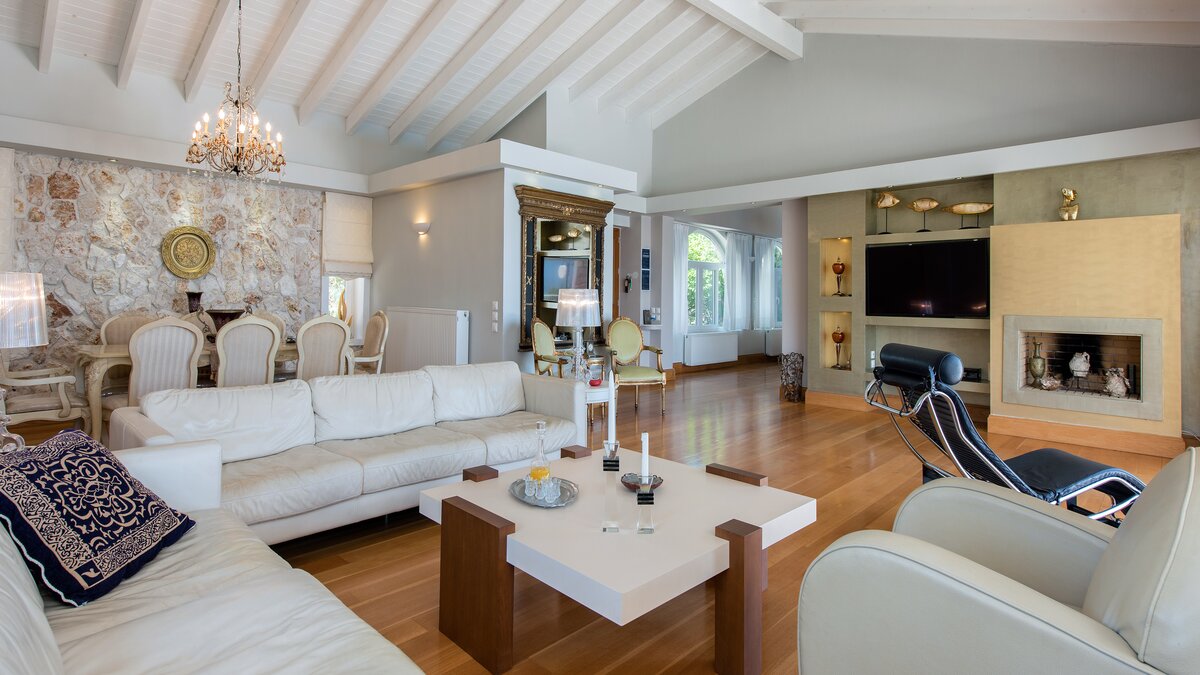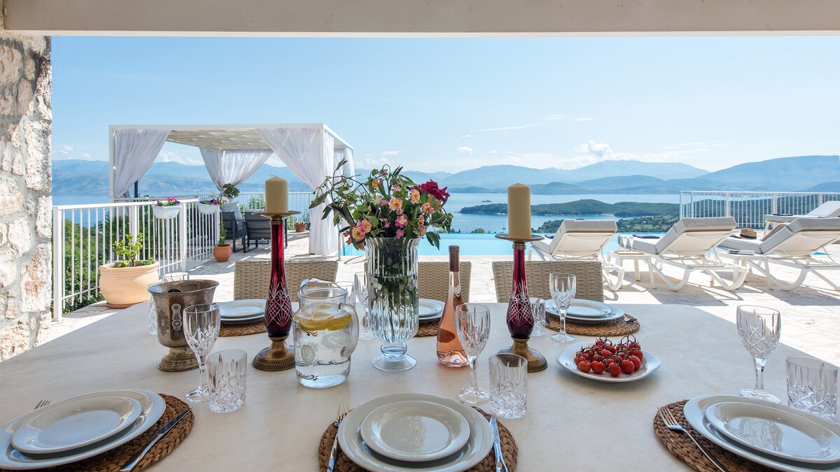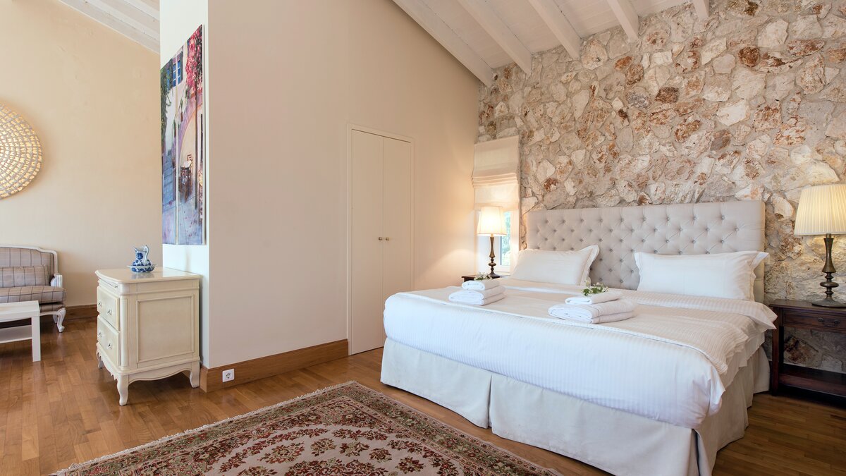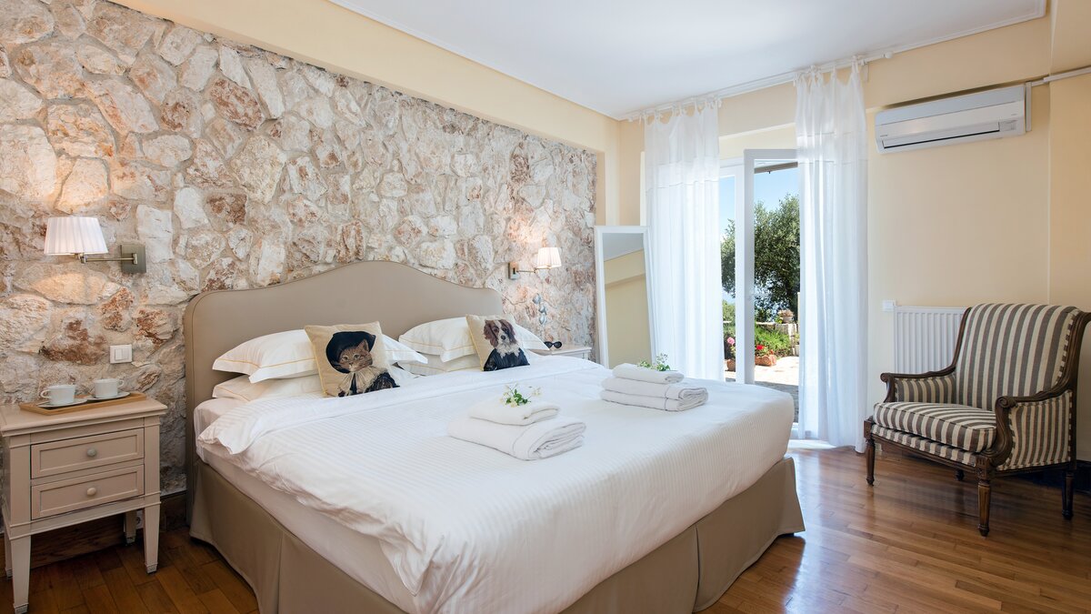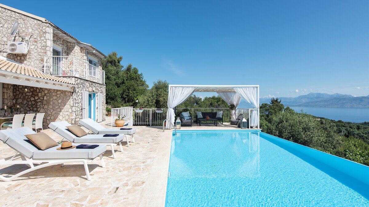 Die drei Schlafzimmer im Erdgeschoss sind individuell gestaltet und alle mit Klimaanlage ausgestattet. Jedes der drei Schlafzimmer im Erdgeschoss verfügt über ein eigenes Bad mit Dusche. Das Haupt-Doppelzimmer befindet sich in privater Lage auf der oberen Ebene und verfügt über einen eigenen Balkon mit Blick auf die herrliche Aussicht. Draußen gibt es eine große, große und schön eingerichtete Terrasse mit einem geschützten Essbereich, einem Wohnzimmer im Freien in einer Pergola mit Vorhängen und dem einladenden Infinity-Pool; alle blicken auf das Blaue der Bucht, über die versilberten Olivenhaine und die roten Dächer von Kassiopi, nur 1,5 km entfernt.