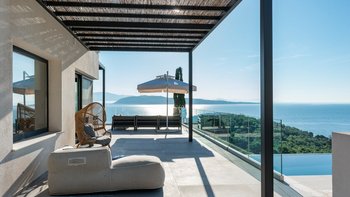 Die Außenbereiche sind einfach spektakulär. Weitläufige Terrassen umgeben die Villa und führen zu einem Infinity-Pool, der nahtlos mit dem Meer dahinter zu verschmelzen scheint. Ein schattiger Wohn- und Essbereich bietet eine einzigartige Kulisse für Mahlzeiten im Freien. Dessen Außenküche und die Bar sind ideal für Versammlungen unter der griechischen Sonne. Ein privater Weg von der Terrasse führt zu einer abgeschiedenen Bucht, wo sich die Gäste am kristallklaren Wasser in absoluter Privatsphäre entspannen können.