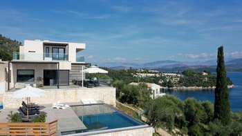 Die Villa Lefkothea liegt auf einem Hügel zwischen zwei Buchten und bietet Panoramablick auf die Stadt Korfu, das Ionische Meer und die Berge Albaniens.