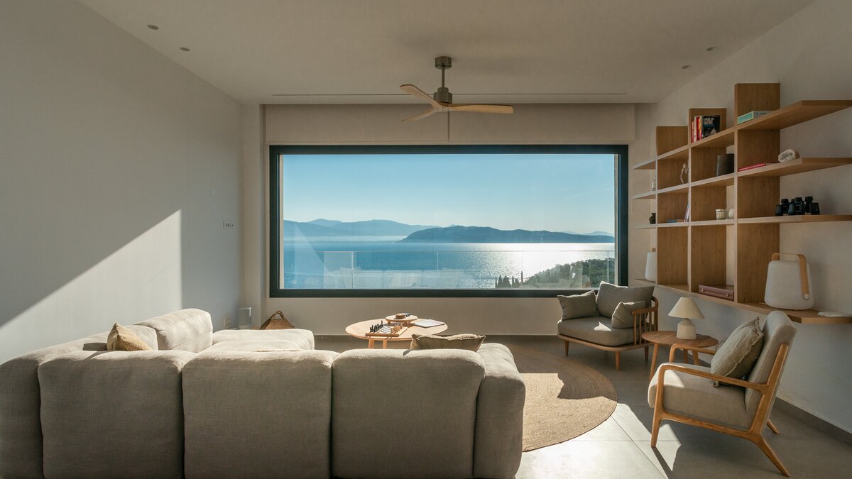 Das Erdgeschoss der Villa Lefkothea ist mit einem OFFENER GRUNDRISS Konzept gestaltet, das Raum und Tageslicht maximiert. Es verfügt über einen geräumigen Wohnbereich mit großen Fenstern und Schiebetüren, die einen atemberaubenden Blick auf das Meer einrahmen. Deren voll ausgestattete Küche verfügt über moderne Geräte und eine Inseleinheit, die sich perfekt zum Beisammensein eignet. Angrenzend an die Küche befindet sich ein separates Arbeitszimmer, das sich ideal für ruhige Momente oder Arbeiten aus der Ferne eignet. Beiden Schlafzimmer verfügen über ein eigenes Duschbad, das den Gästen zusätzliche Privatsphäre bietet.