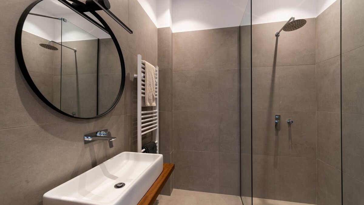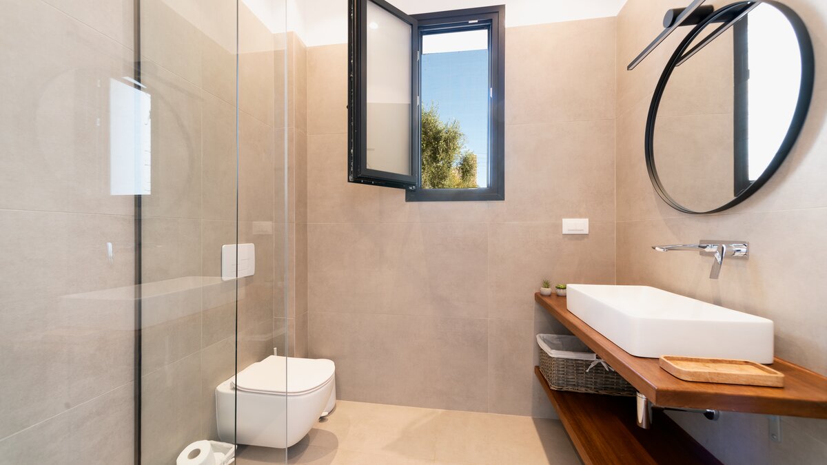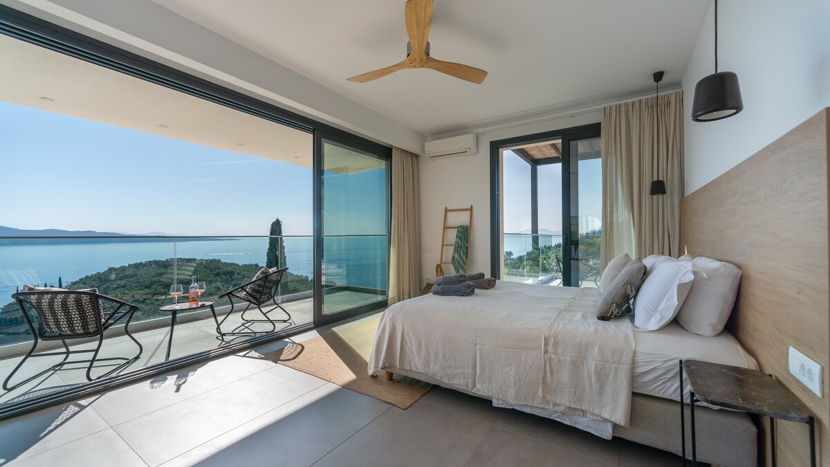 Die erste Etage hebt den Charme der Villa mit ihren intimen Räumen zur Entspannung hervor. Jedes Zimmer auf dieser Ebene verfügt über ein eigenes Bad, das in neutralen Farbtönen gehalten ist und eine ruhige Atmosphäre schafft. Die Innenräume sind von weißen Farbtönen mit subtilen Beige-Akzenten geprägt, die das ruhige Ambiente der Villa ergänzen. Alle Schlafzimmer öffnen sich zu einer Terrasse mit Blick auf das azurblaue Wasser und bieten den Gästen einen ungestörten Blick auf die natürliche Schönheit Korfus.