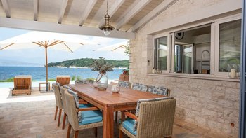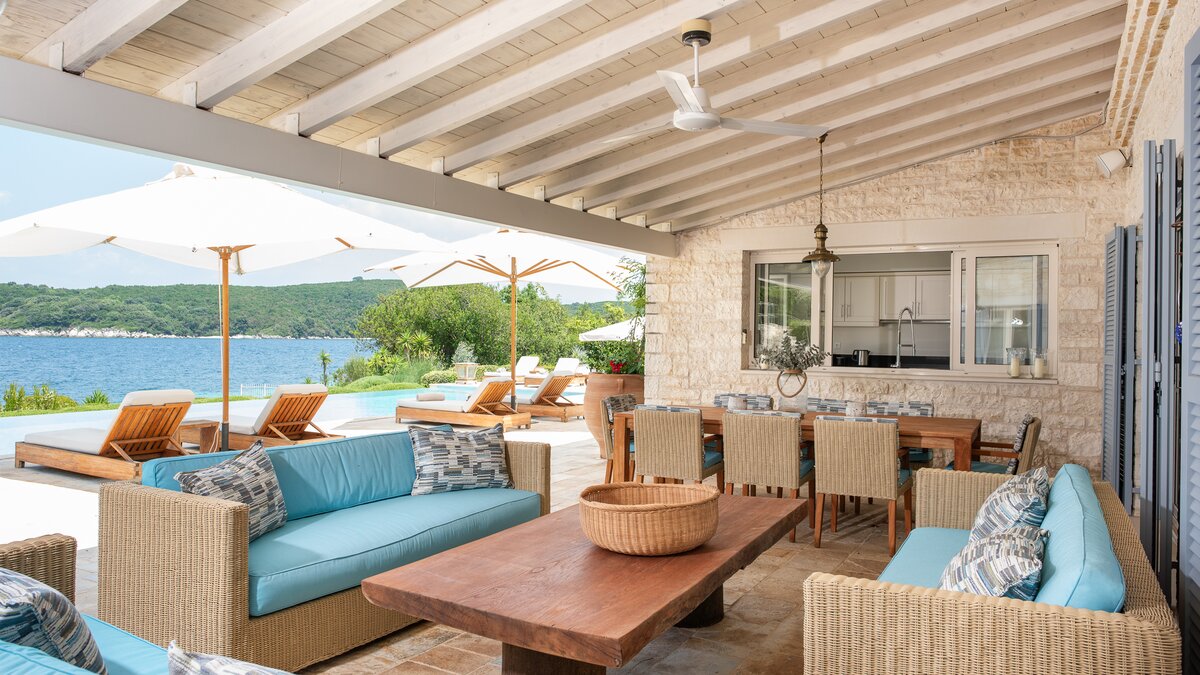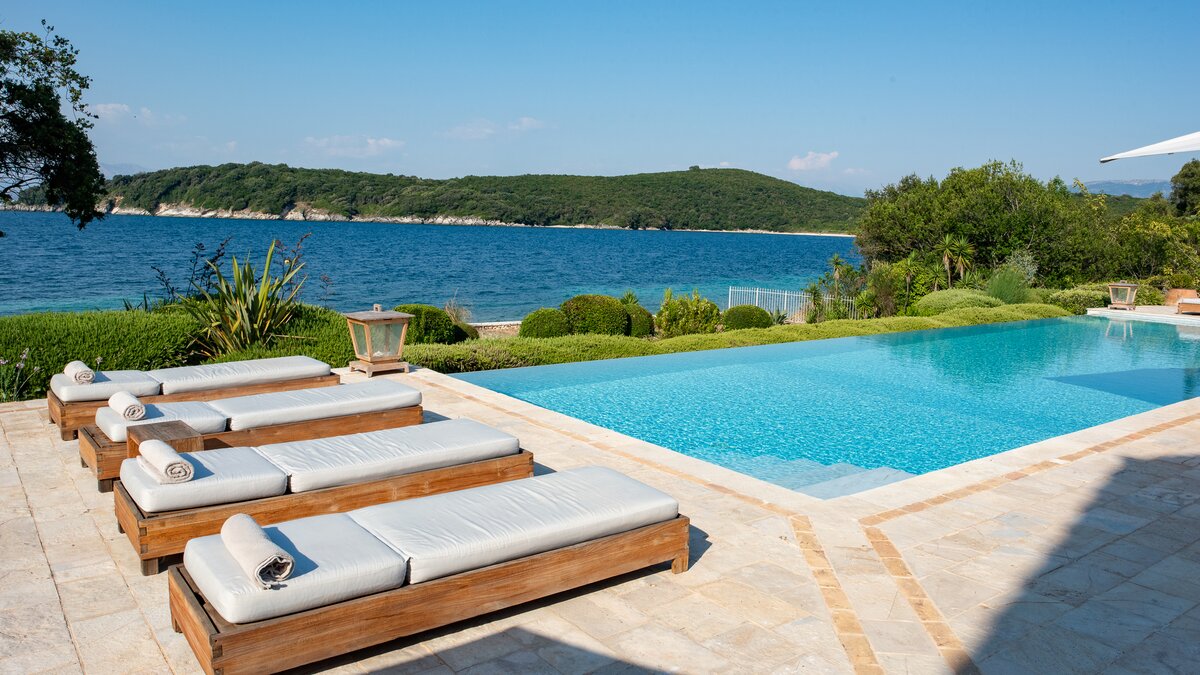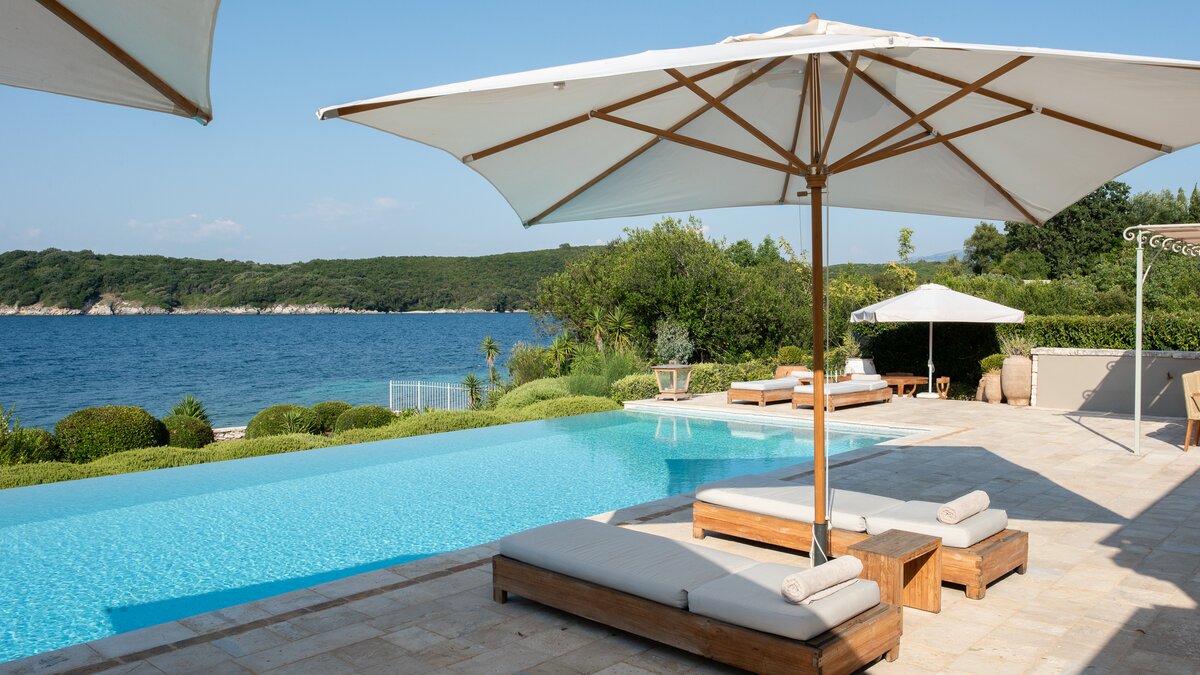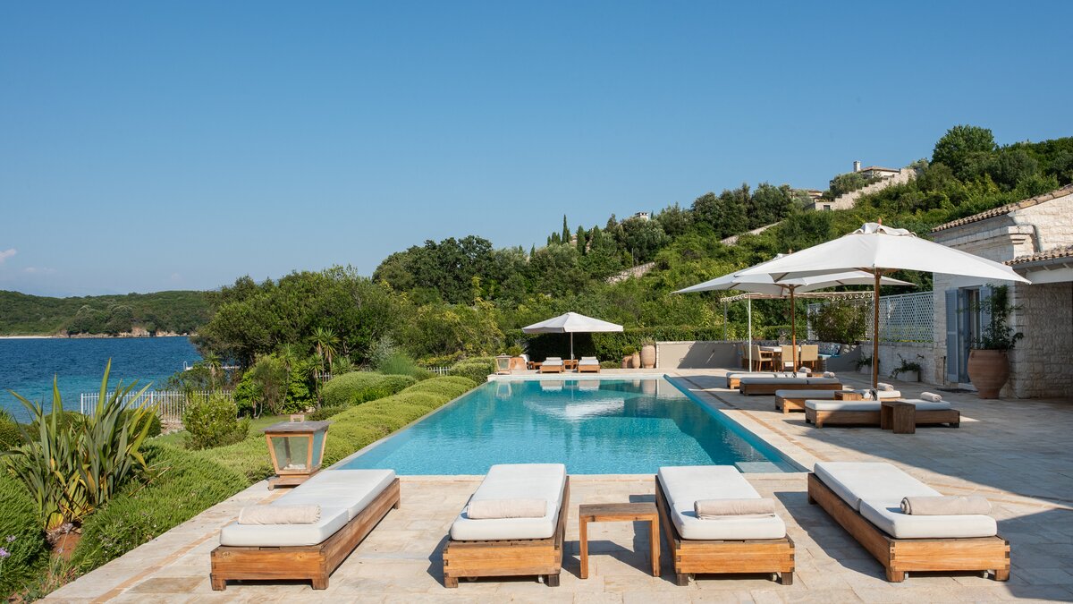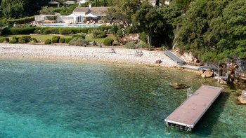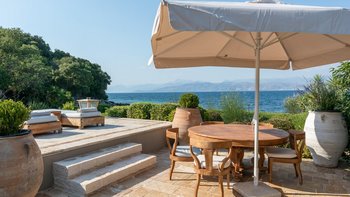 Set in gardens that hem the seafront, with glorious views and a jetty over the water, this luxury villa in Corfu is a contemporary classic, with a twist of tradition adding character and charm.