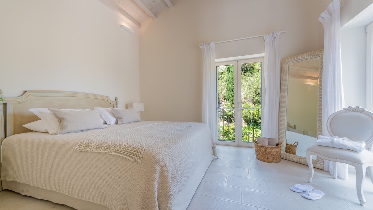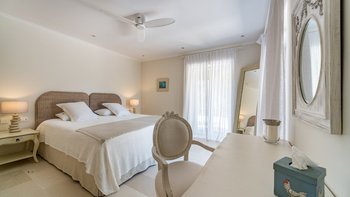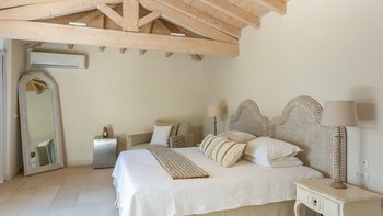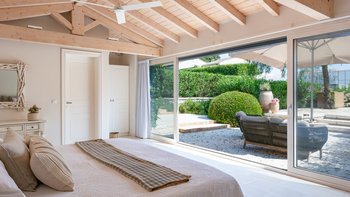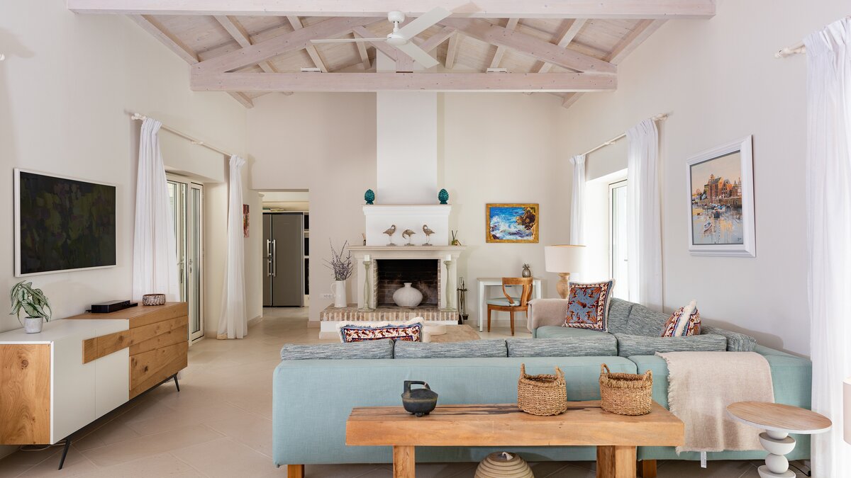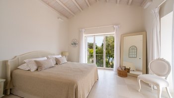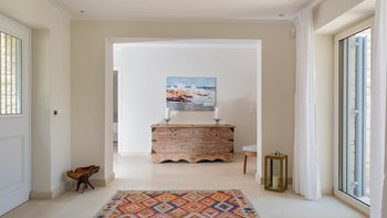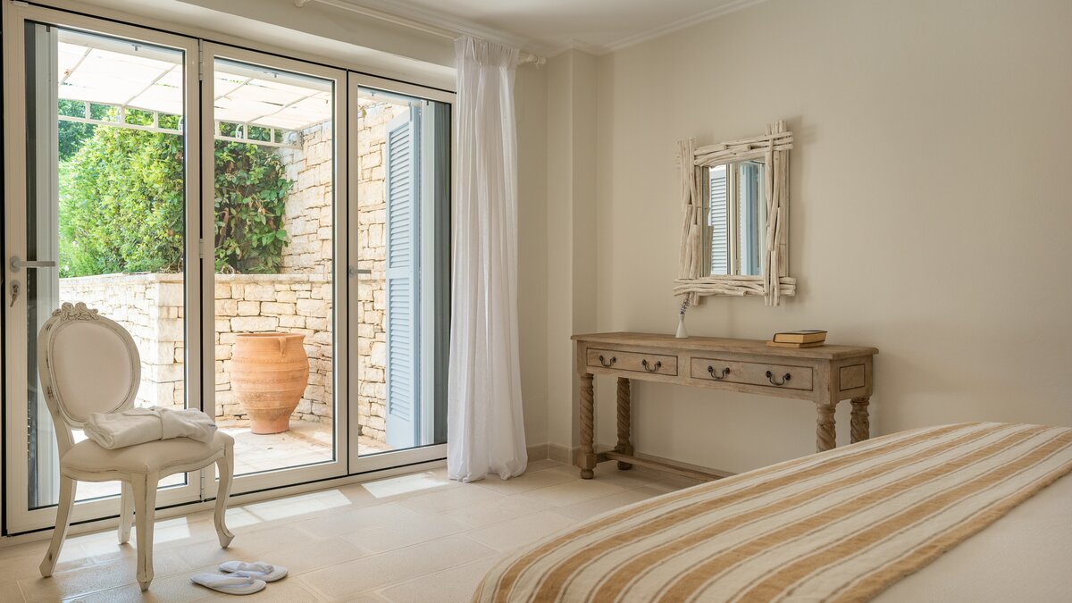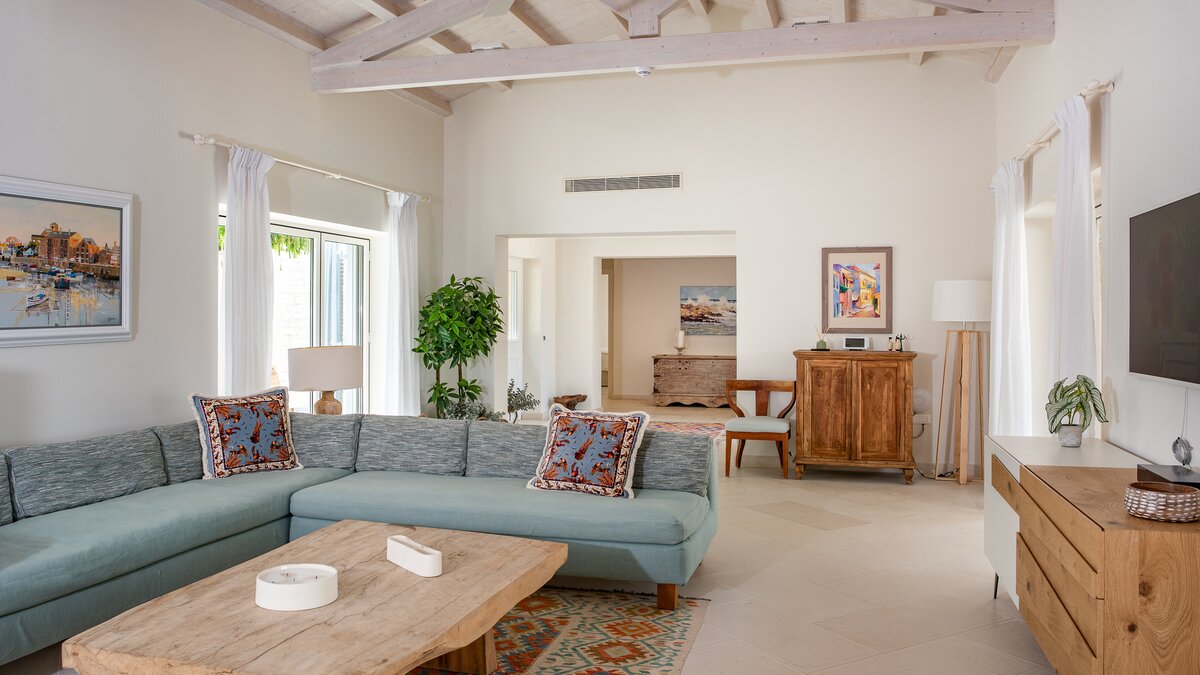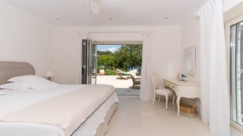 Das Wohn-/Esszimmer im Freien mit Blick auf den Pool und das Meer ist so stilvoll und einladend wie sein Indoor-Äquivalent, und eine Pergola auf den Felsen bietet einen komfortablen Aussichtspunkt mit prallen gepolsterten Sitzgelegenheiten und marokkanischen Lampen. Innerhalb des Hauses befinden sich ein Fitnessstudio, ein Heimkino und fünf luftige Schlafzimmer, mit Privatsphäre für das sechste Schlafzimmer in einem separaten Gästeanbau. Obwohl die Villa Iona ruhig und privat gelegen ist, ist es nur eine kurze Fahrt oder fünfundzwanzig Minuten zu Fuß von lokalen Geschäften, Bars und Tavernen.