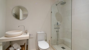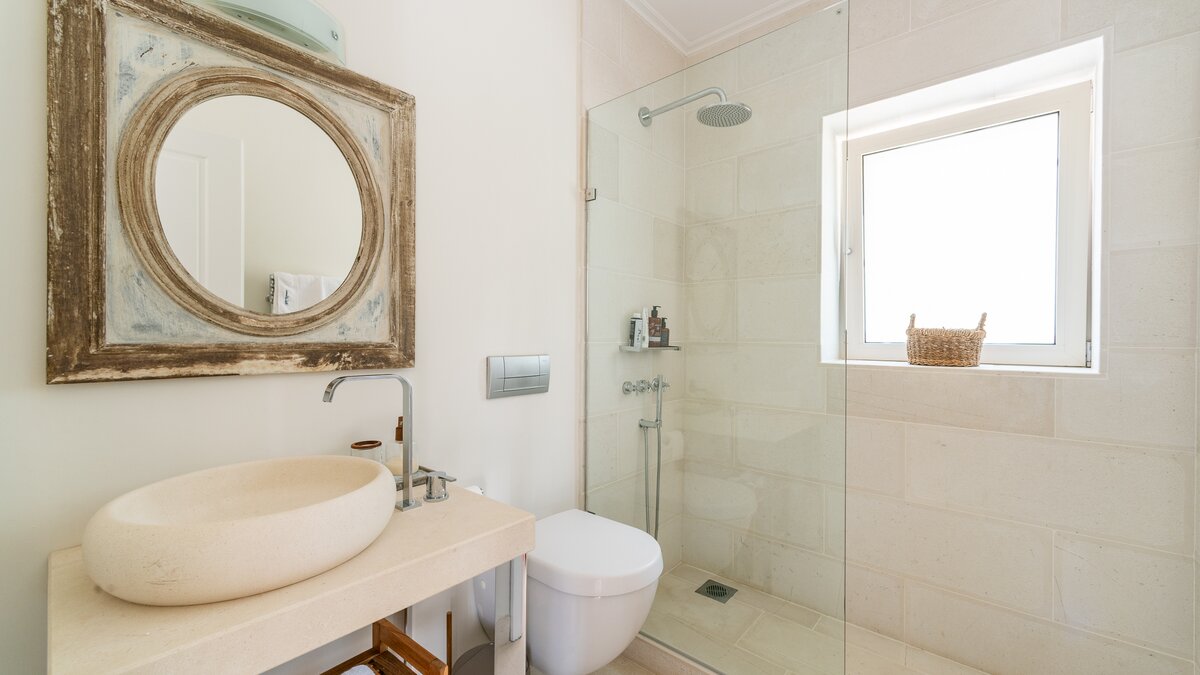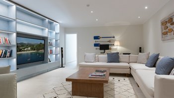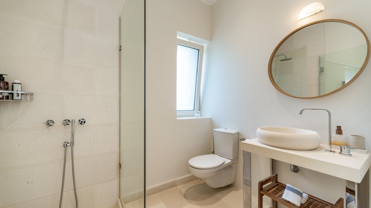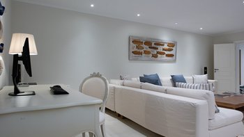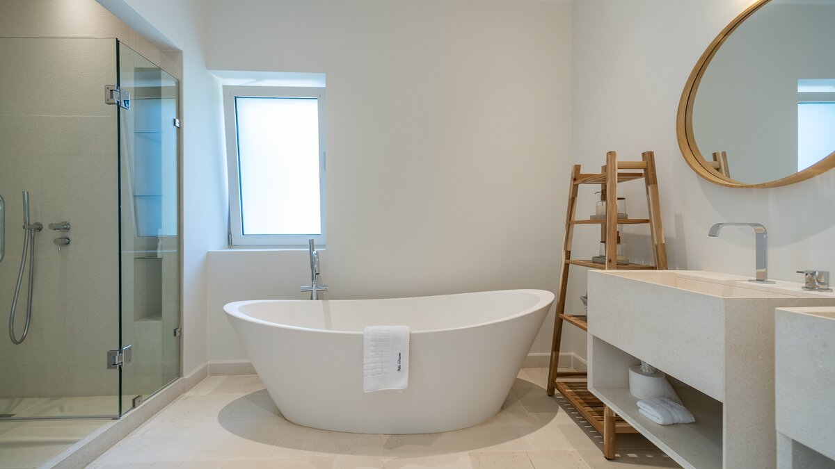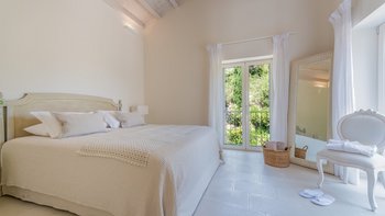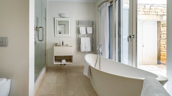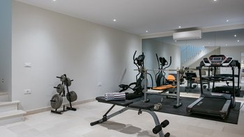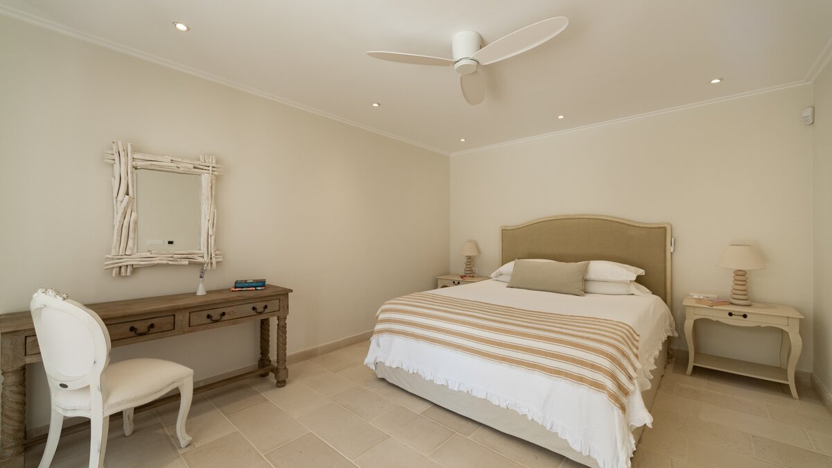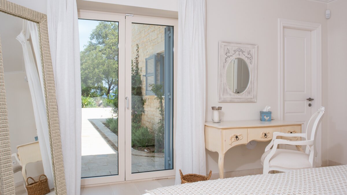 Das Wohn-/Esszimmer im Freien mit Blick auf den Pool und das Meer ist so stilvoll und einladend wie sein Indoor-Äquivalent, und eine Pergola auf den Felsen bietet einen komfortablen Aussichtspunkt mit prallen gepolsterten Sitzgelegenheiten und marokkanischen Lampen. Innerhalb des Hauses befinden sich ein Fitnessstudio, ein Heimkino und fünf luftige Schlafzimmer, mit Privatsphäre für das sechste Schlafzimmer in einem separaten Gästeanbau. Obwohl die Villa Iona ruhig und privat gelegen ist, ist es nur eine kurze Fahrt oder fünfundzwanzig Minuten zu Fuß von lokalen Geschäften, Bars und Tavernen.