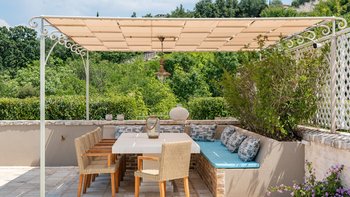 Mit ihren robusten Steinmauern, dem traditionellen Ziegeldach und den Fensterläden aus Holz wirkt diese entzückende Villa auf den ersten Blick wie ein weitläufiges altes Bauernhaus, umgeben von olivenschattenden Terrassen und von Lavendel gesäumten Wegen. Bei genauerem Hinsehen entdeckt man eine schicke, moderne und sehr luxuriöse Villa, die durch ein prächtiges Tor, das ursprünglich einen indischen Palast schmückte, zugänglich ist und den Genuss von Frühstücksservice, Haushälterin und Concierge-Service bietet. Ein 17 Meter langer Infinity-Pool und ein 30 Meter langer Garten trennen das Haus vom Ufer.