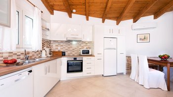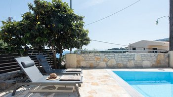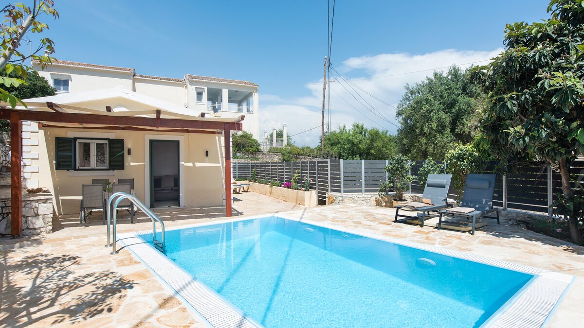 Im Freien lädt eine große, von Bäumen und Pergolen beschattete Terrasse zu gemütlichen Frühstücken oder abendlichen Drinks ein. Der Privater Pool mit Blick auf das Ionische Meer bietet einen erfrischenden Ort, um sich zu entspannen, während Sie die Aussicht genießen. Ein eingebauter Grill und mehrere Liegebereiche machen diesen Raum ideal für entspannte Tage und entspannte Abende unter dem Sternenhimmel.