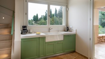 Diese Villa ist ideal für das Leben im Freien und bietet mehrere Sitzgelegenheiten im Freien, darunter einen Esstisch im Freien mit Kühlschrank, Pizzaofen und eingebautem Grill. Es gibt auch eine Yoga-Terrasse mit Yogamatten, Badmintonplatz, Tischtennis, Basketballnetz und Bouleplatz. Des Widerstands ist der unglaubliche 25-Meter-Pool, der vom Hauptpool getrennt ist und sich ideal zum Schwimmen eignet. Deren Anwesen befindet sich in einer fantastischen Lage. Es ist nur eine kurze Fahrt von Kouloura mit einem schönen Strand und einer Taverne und von Kalami mit einer großen Auswahl an Restaurants, kleinen Geschäften und einem Strand entfernt. Denen Gäste können auch nach Sinies laufen, das 1 km entfernt ist und einen Supermarkt und ein Café umfasst.